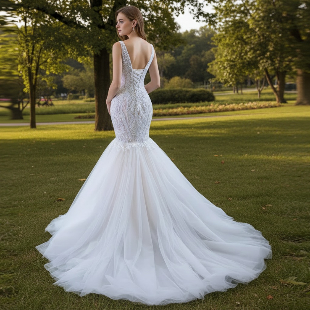 La atractiva espalda baja añade un toque de sofisticación, mientras que las capas de tul suave crean un movimiento y volumen etéreos. Elaborado con meticulosa atención al detalle, este vestido está disponible en tallas estándar y grandes, garantizando que cada novia pueda disfrutar de su ajuste mágico. Perfecto para bodas al aire libre, campestres o rústicas, este brillante vestido de corte trompeta te hará brillar mientras celebras tu historia de amor con un vestido que se siente tan hermoso como se ve.