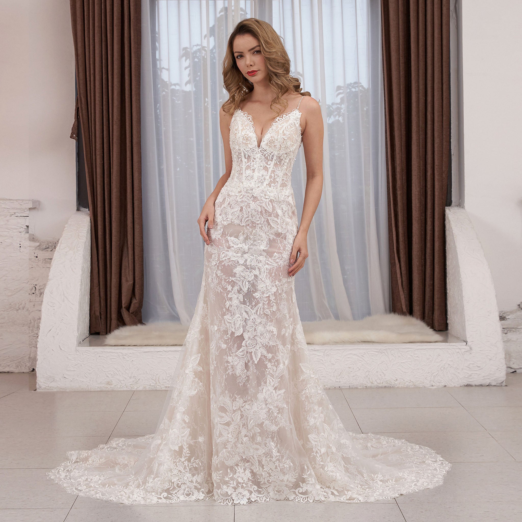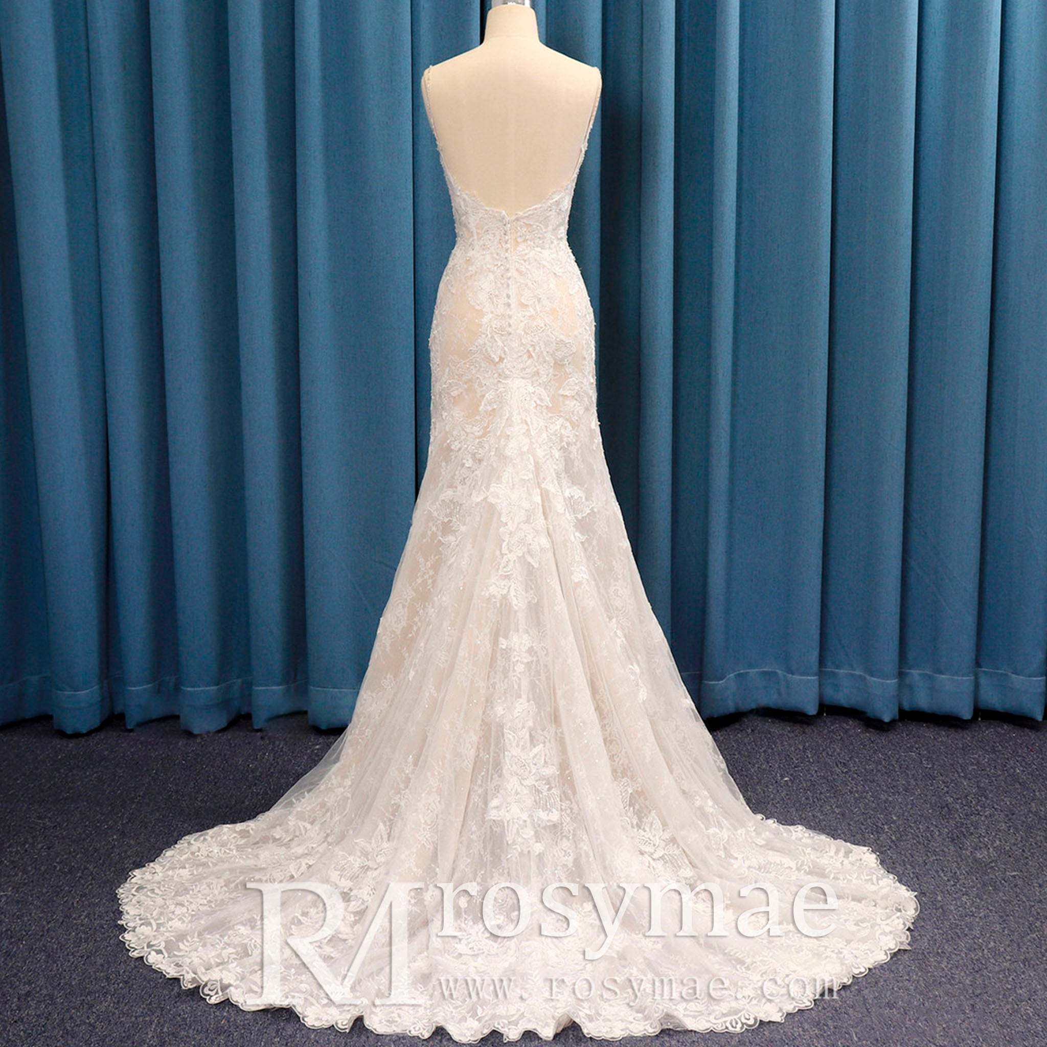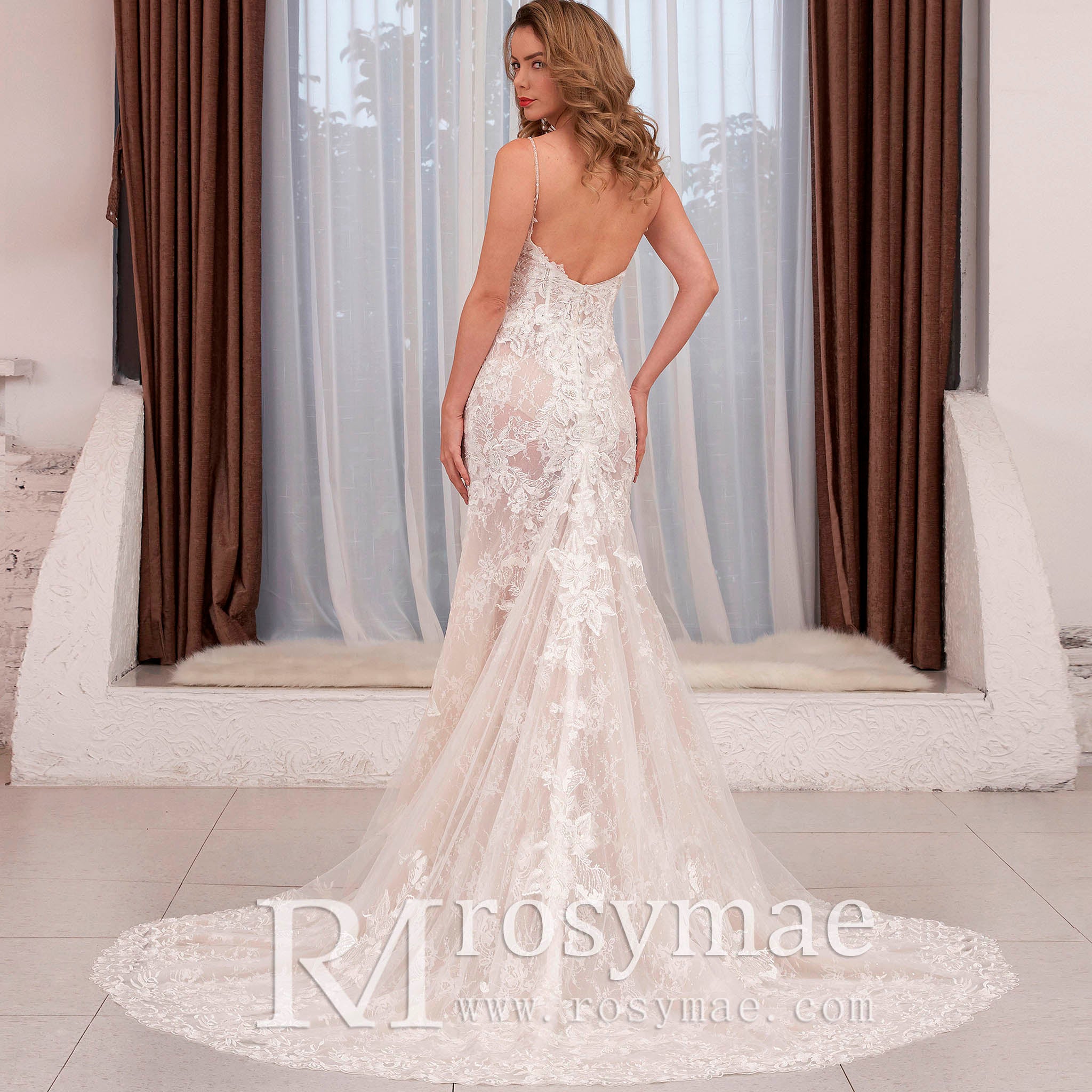 Este elegante vestido de novia con tirantes finos presenta espalda escotada, cola capilla y corpiño y falda transparentes, creando un look atemporal y romántico. El diseño ajustado y acampanado acentúa tu figura mientras que el cuello en V añade un toque de sofisticación. Perfecto para la novia moderna que busca un look nupcial clásico y femenino.