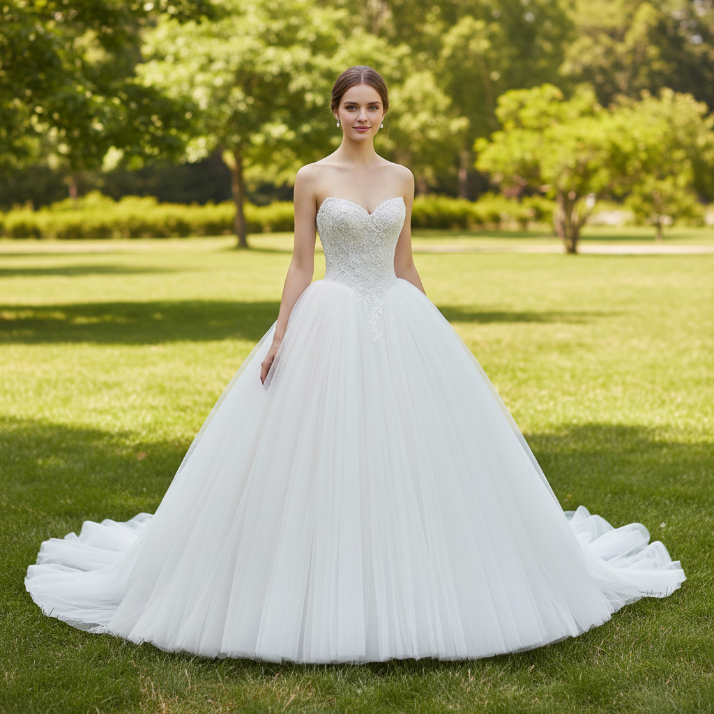 Luce lo mejor posible en el día más especial de tu vida con este romántico vestido de novia sin tirantes de tul. Con un escote en forma de corazón con detalles de aplicaciones de encaje y una impresionante cola catedral para mayor elegancia, dejarás una impresión duradera en tu día especial.
