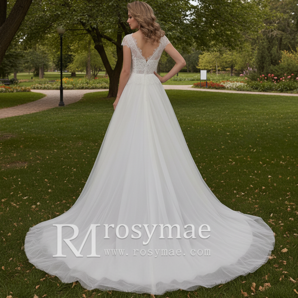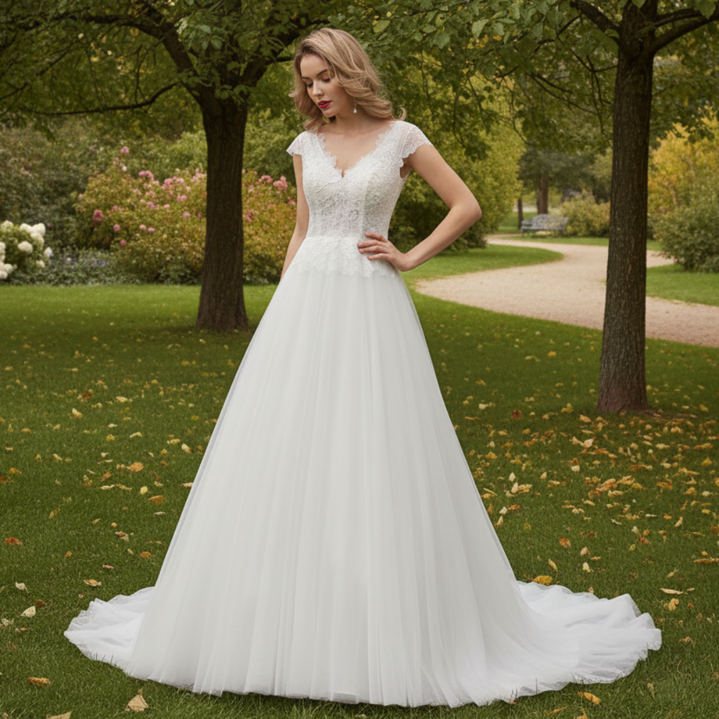 Este elegante vestido de novia presenta un diseño de cuello en V y tul ligero, creando una favorecedora silueta de corte A. Las mangas japonesas añaden un toque de feminidad mientras que la espalda escotada aporta un toque moderno. Perfecto para la novia que busca un look atemporal y romántico en su día especial.