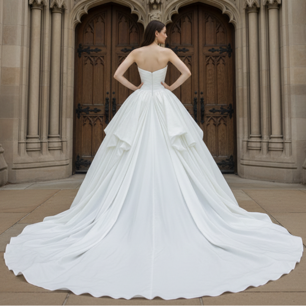 Este impresionante vestido de novia sin duda elevará tu look para el día de tu boda. Su hermoso escote curvo, combinado con la falda amplia y abullonada, crea una silueta clásica que sin duda dejará una huella imborrable. Siéntete como una princesa con este deslumbrante vestido y deja que su majestuoso estilo conquiste los corazones de todos tus invitados.