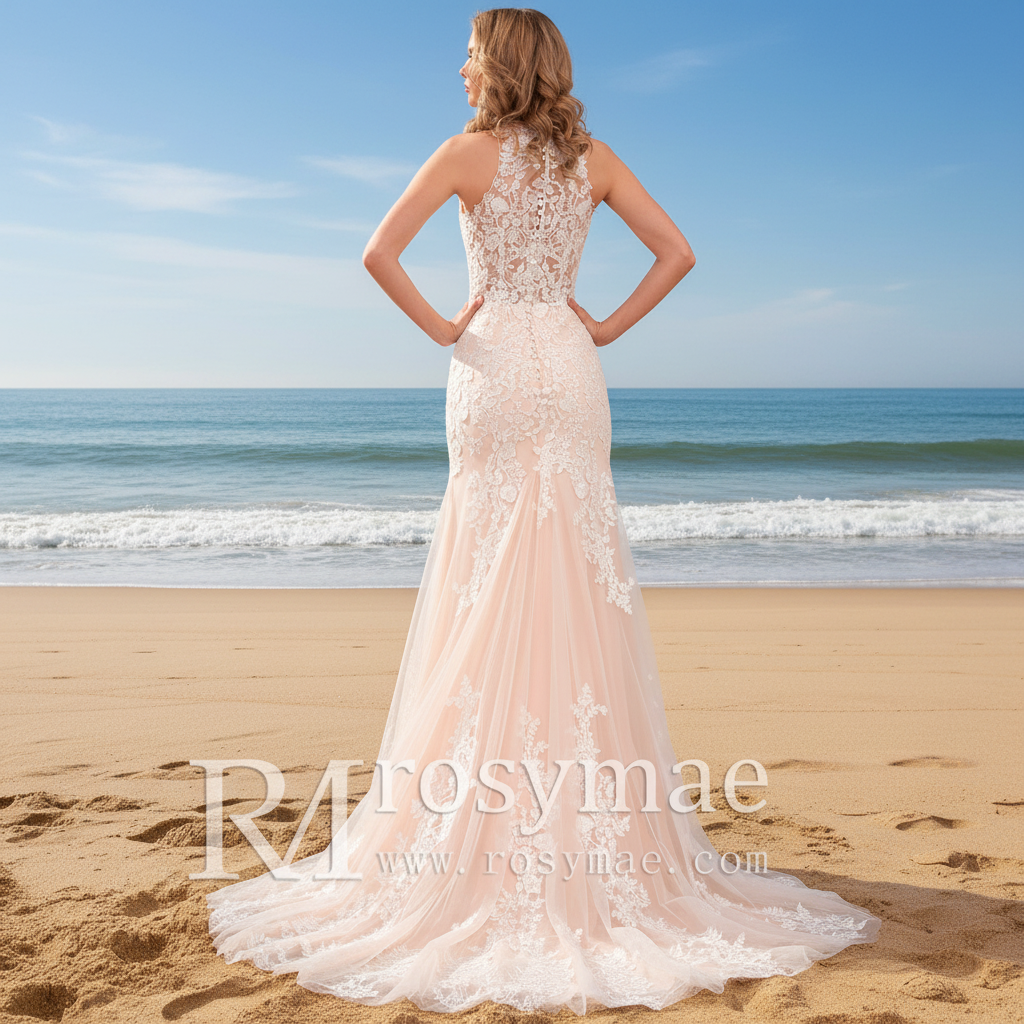 Este cautivador vestido de novia presenta un corpiño transparente con espalda alta y transparente, completo con un encantador escote en V y un elegante color champán. Diseñado para un ajuste impecable y una silueta acampanada, este vestido te hará sentir deslumbrante y segura en tu día especial.