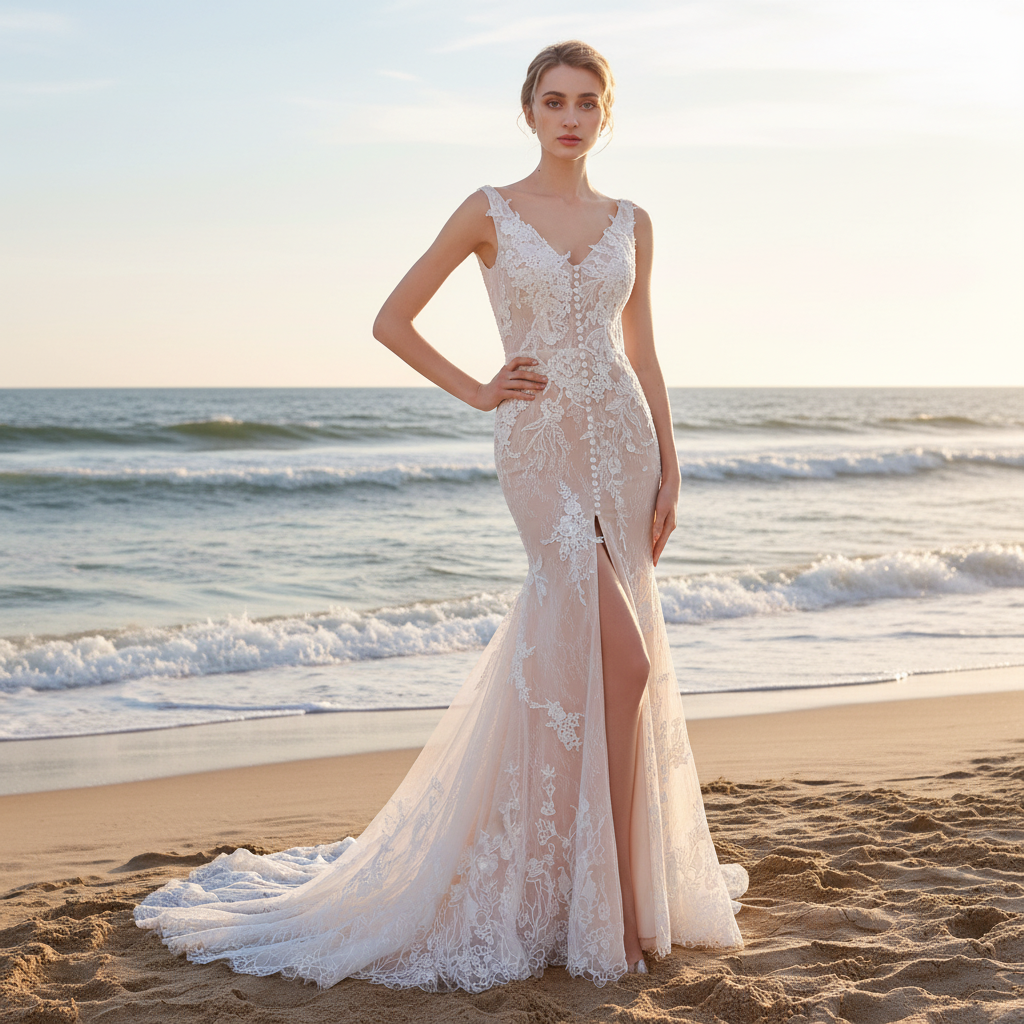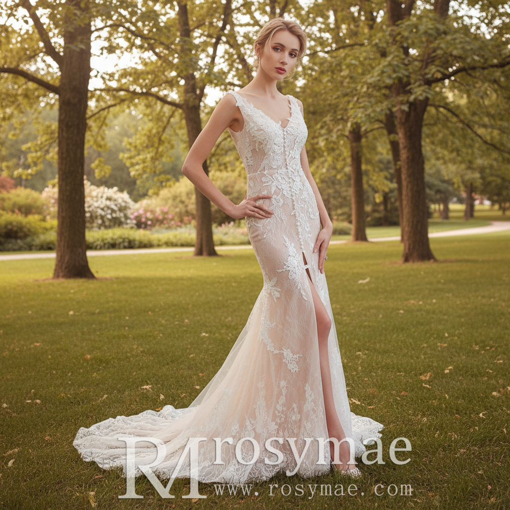Realza tu belleza con nuestro elegante vestido de novia de encaje con escote en V y hombros descubiertos. Este vestido, con espalda descubierta, acentúa tus curvas con su diseño ajustado y acampanado. El corpiño transparente añade un toque de sensualidad, mientras que la abertura central permite un movimiento cómodo. Perfecto para tu día especial.