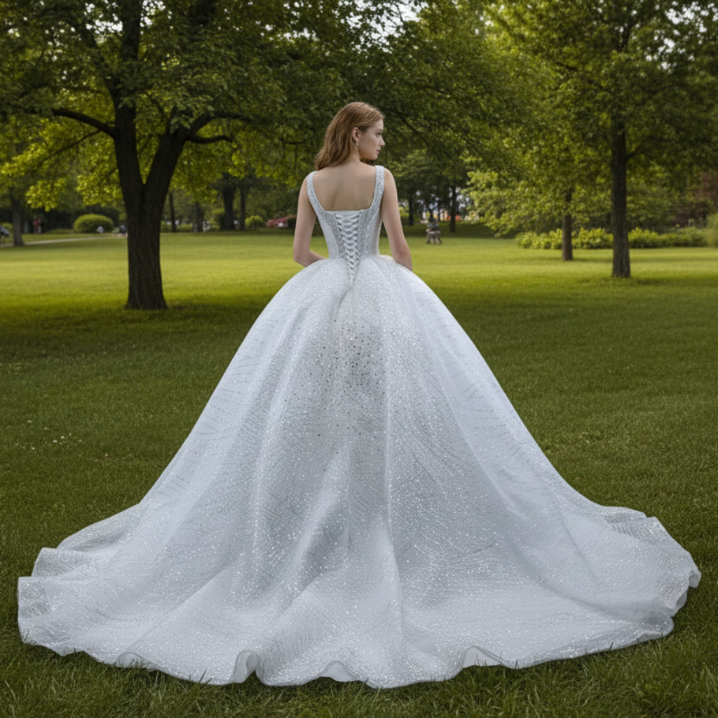 Este vestido de novia, elaborado artesanalmente, encarna el lujo atemporal con meticulosos bordados de cuentas e intrincados detalles de lentejuelas que capturan y reflejan la luz. El refinado escote cuadrado ofrece una silueta clásica y sofisticada, mientras que la falda voluminosa y estructurada crea una silueta majestuosa, digna de un cuento de hadas. Diseñado para un impacto máximo, el vestido concluye con una espectacular cola catedral que fluye con elegancia, garantizando una entrada espectacular. Confeccionado para momentos inolvidables, este exquisito vestido promete hacer de cada ocasión algo verdaderamente especial.