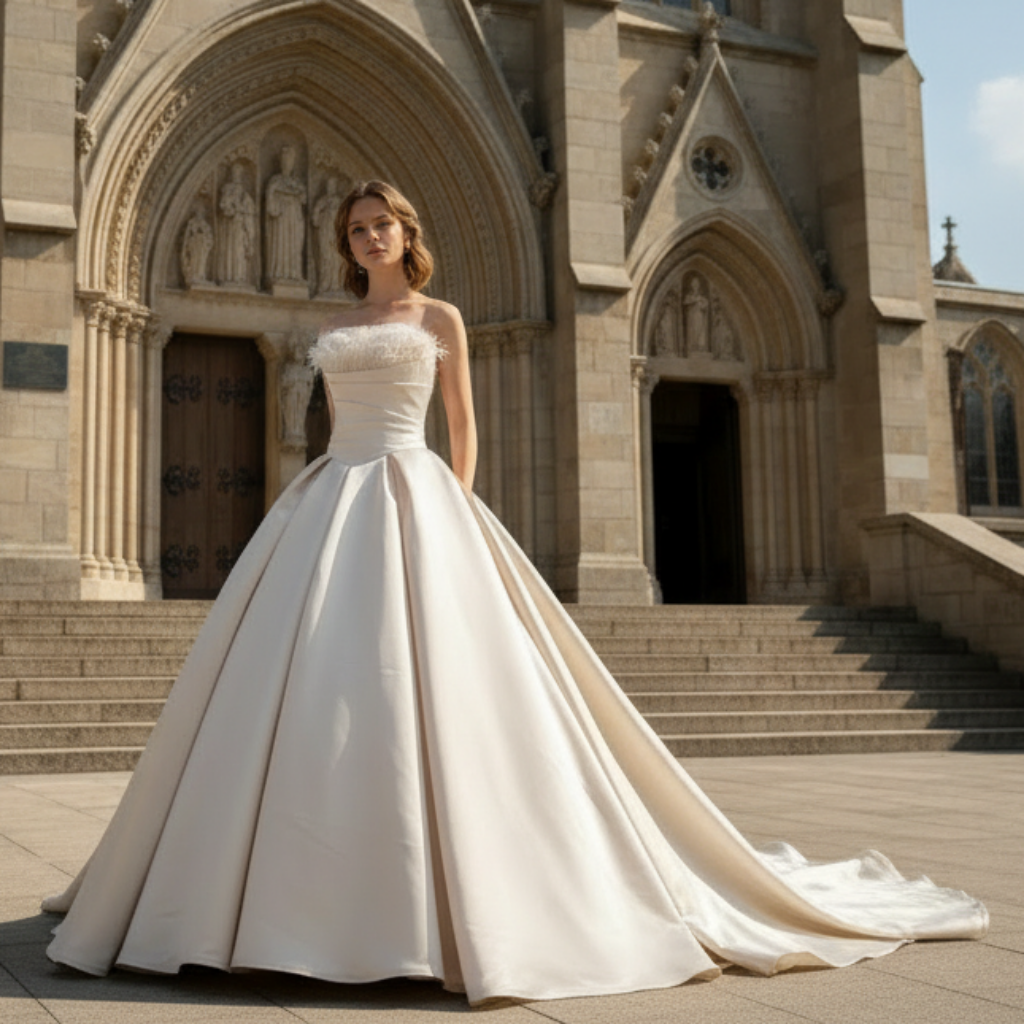 Este exquisito vestido de gala de satén color champán personifica la elegancia atemporal. Su escote recto enmarca delicadamente los hombros y realza el escote con refinada sencillez. El corpiño presenta detalles de drapeado y pliegues magistralmente elaborados, creando capas texturizadas que aportan profundidad visual y definen la silueta para un ajuste favorecedor. La falda, que fluye desde el corpiño estructurado, se abre en una forma amplia y fluida, realzada por una espectacular cola catedral que se extiende con gracia tras la novia, elevando la presencia majestuosa del vestido. Detalles adicionales, como el sutil volante y los adornos de plumas en el cuello, añaden un toque moderno de sofisticación y movimiento, equilibrando el diseño clásico con un atractivo contemporáneo. Diseñado para novias que buscan una fusión armoniosa entre estructura arquitectónica y fluidez, este vestido promete una declaración inolvidable marcada por la gracia y la grandeza en el día de su boda.