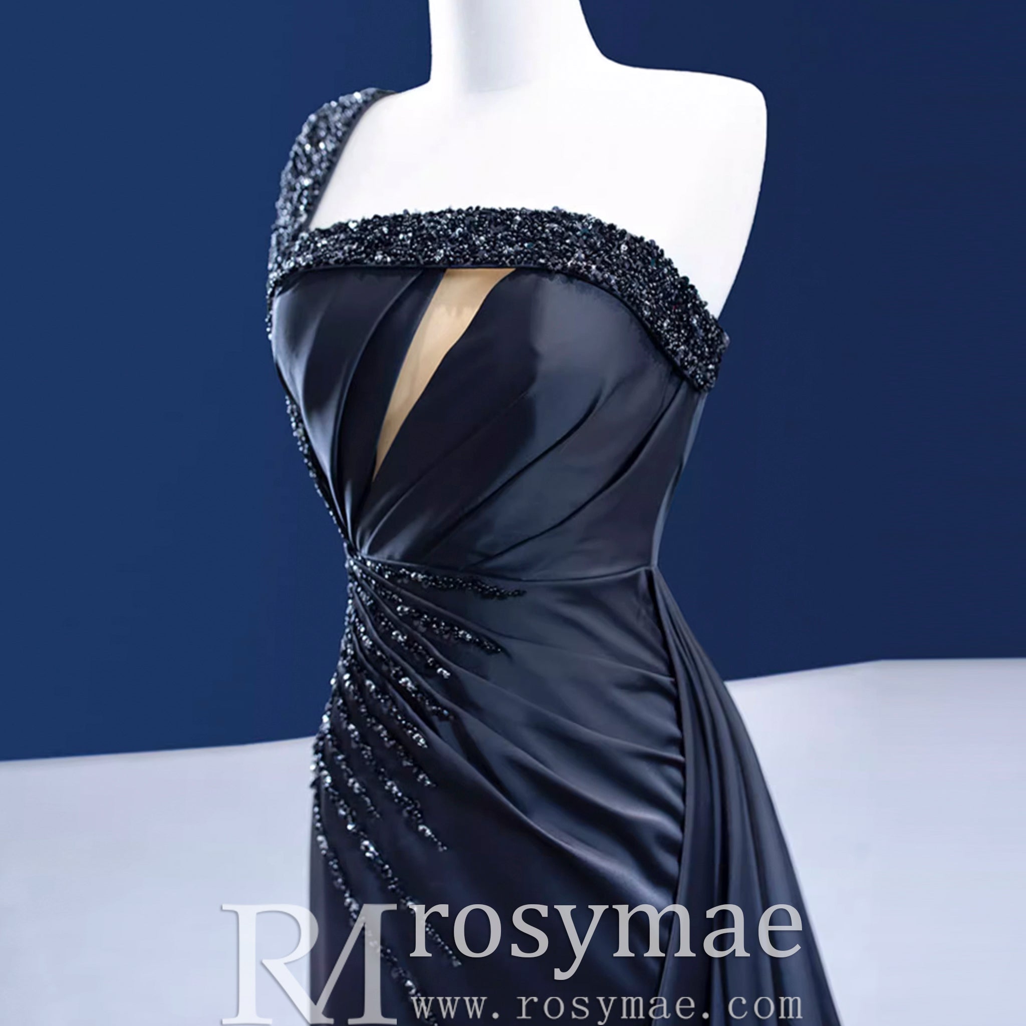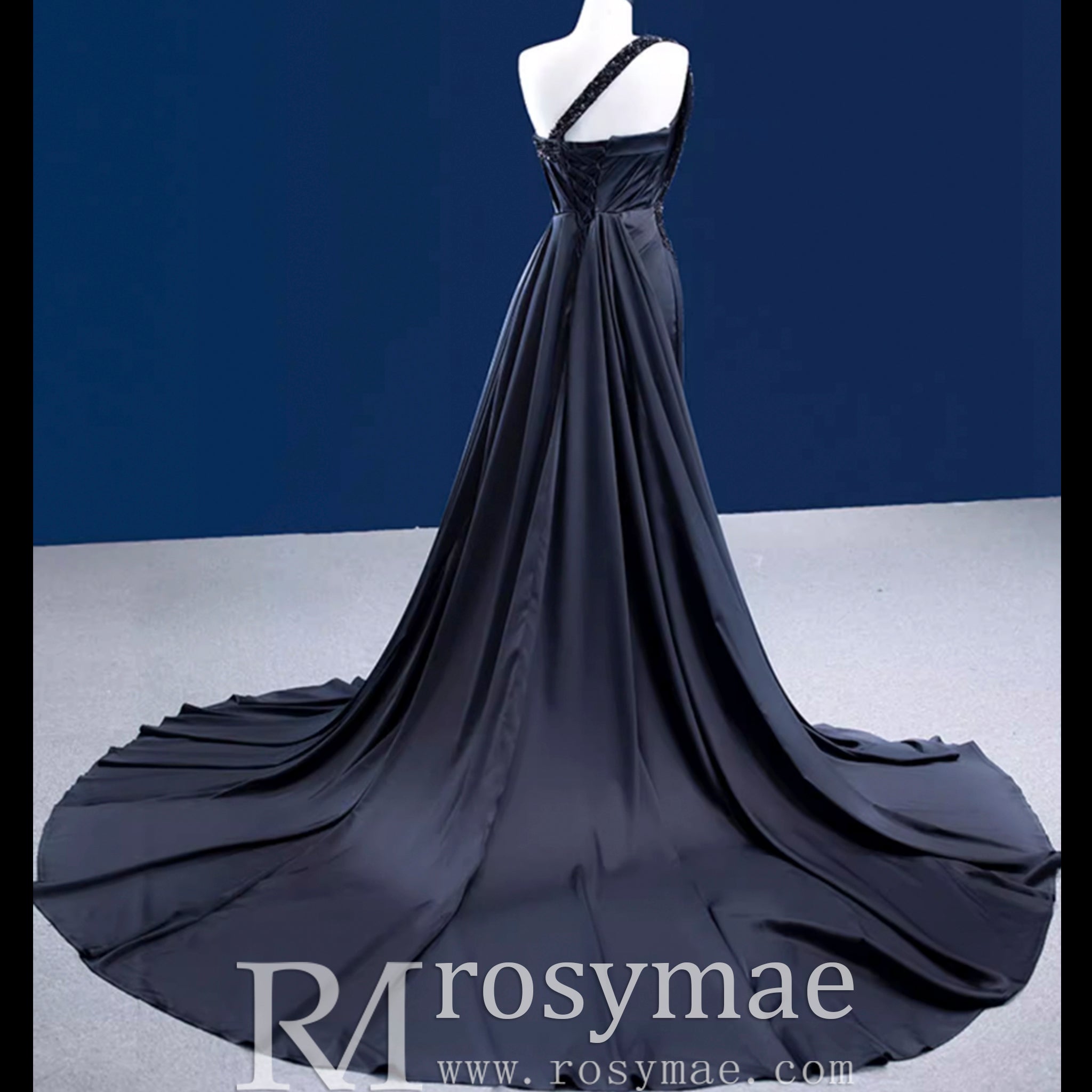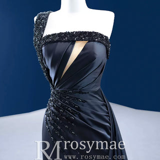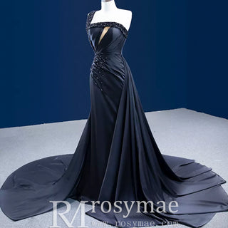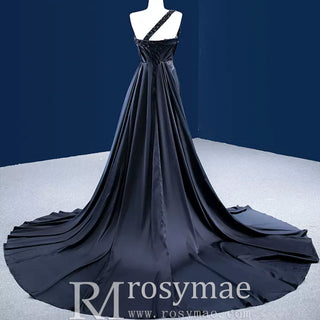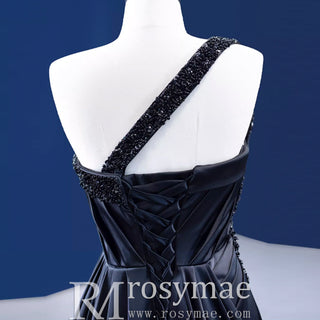 Vestido de novia de satén negro, entallado y con vuelo, de un hombro y con pedrería