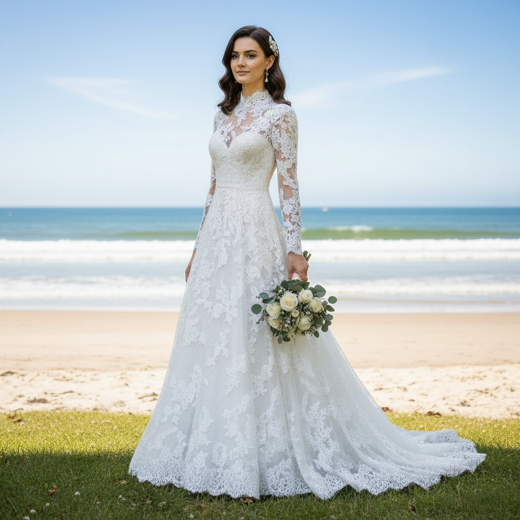 Este exquisito vestido de novia combina una sofisticación atemporal con una elegancia moderna. El escote alto y las mangas largas crean una estética refinada y discreta, mientras que los delicados detalles de encaje de tul le aportan un toque romántico. La favorecedora silueta en forma de A se adapta con gracia al cuerpo, ofreciendo comodidad y una línea visual impactante que queda perfecta en las fotografías. La cola capilla impacta dramáticamente al caminar hacia el altar, creando una entrada inolvidable. El intrincado trabajo de encaje demuestra una artesanía excepcional, con mangas transparentes que dejan entrever sutiles destellos de piel para un toque contemporáneo. Este vestido logra el equilibrio perfecto entre la tradición nupcial clásica y la sensibilidad del diseño moderno, lo que lo convierte en la opción ideal para la novia exigente que busca un lujo discreto. Ya sea una celebración formal o íntima, este vestido ofrece la elegancia y la presencia que tu día especial merece.