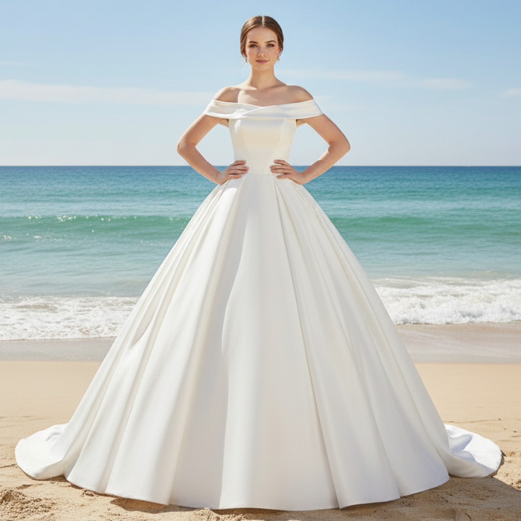 Este vestido de novia con hombros descubiertos presenta un escote recto y una voluminosa falda abullonada, creando una silueta de vestido de fiesta elegante y atemporal. Confeccionado con una lujosa tela satinada, añade un toque de sofisticación y gracia a tu día especial.