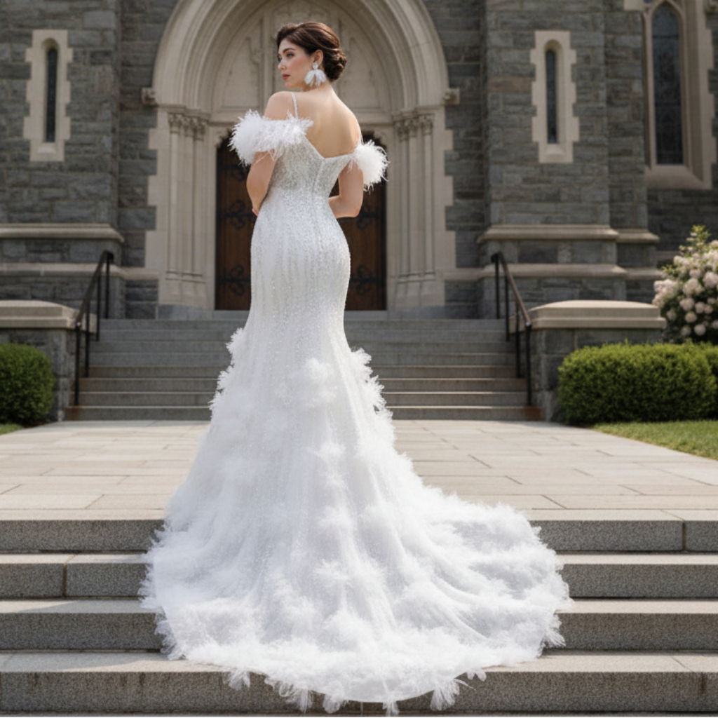 Sumérgete en el romance atemporal y la elegancia moderna con este vestido de novia sirena, elaborado artesanalmente. El corpiño ajustado, adornado con delicadas cuentas y elegantes volantes, realza tu silueta con una hermosa caída en una impresionante cola capilla. El escote de hombros descubiertos, realzado por un favorecedor escote en V, añade un toque sofisticado, complementado con paneles transparentes y un sutil brillo que crea un brillo etéreo. Perfecto para una boda en la playa de ensueño o cualquier celebración especial, este vestido combina la exquisita artesanía con la belleza natural.