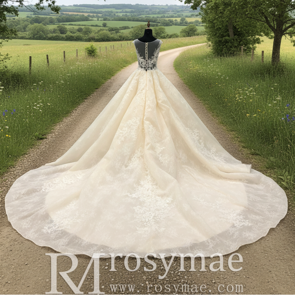 Este lujoso vestido de novia estilo princesa personifica la elegancia atemporal a través de cada detalle meticulosamente elaborado. Las delicadas mangas cortas enmarcan los hombros con elegancia, armonizando a la perfección con el escote redondo transparente que realza sutilmente el escote con gracia y sofisticación. Su característica más destacada es su espalda alta y transparente, realzada por una hilera de botones finamente elaborados que le otorgan un acabado clásico y refinado. El conjunto está profusamente adornado con un intrincado encaje floral, ricamente adornado con brillantes cuentas que brillan con cada movimiento, aportando dimensión y un brillo cautivador. Desde la cintura ajustada, la voluminosa falda se despliega en una impresionante cola catedral, diseñada para caer dramáticamente detrás de la novia y asegurar una presencia impactante al llegar al altar. Este vestido combina magistralmente el encanto romántico con la majestuosidad real, convirtiéndolo en una opción excepcional para las novias que desean un vestido de novia que sea a la vez encantador y majestuoso, prometiendo un momento inolvidable en su día especial.
