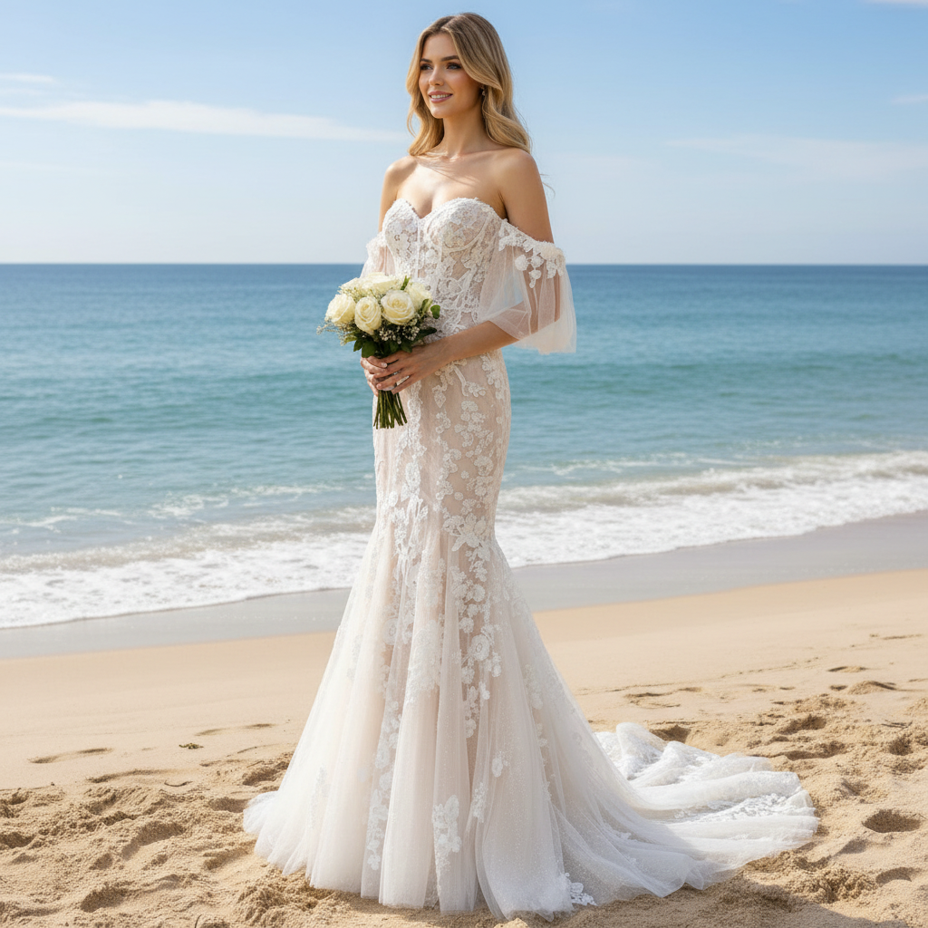 Vestido de novia de sirena con escote en forma de corazón, de tul y encaje color champán