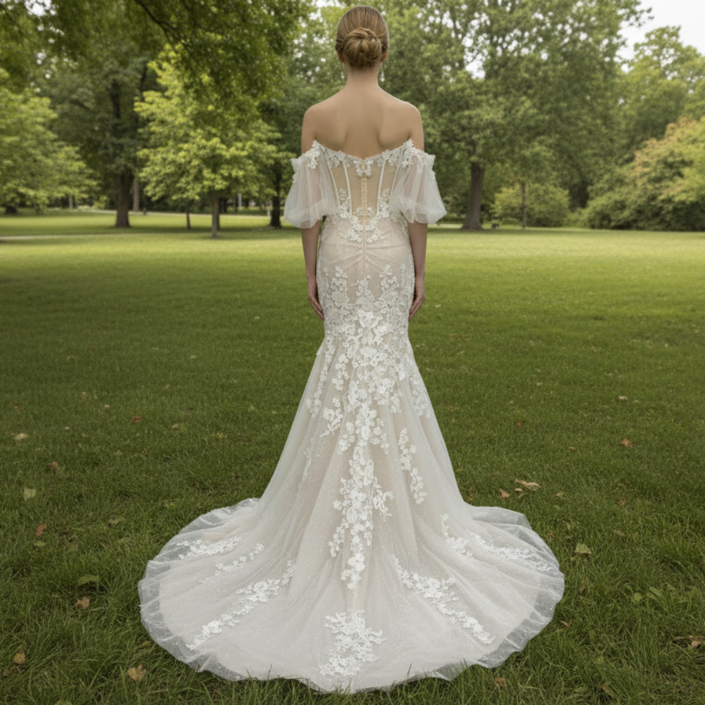 Este vestido de novia color champán presenta un escote en forma de corazón que añade un toque de romanticismo a tu día especial. El encaje de tul hecho a mano crea una sensación de elegancia y encanto. Con un diseño con hombros descubiertos y escote y espalda transparentes, este vestido es perfecto para la novia moderna. Camina hacia el altar con confianza y gracia con este impresionante vestido con una amplia cola de capilla.