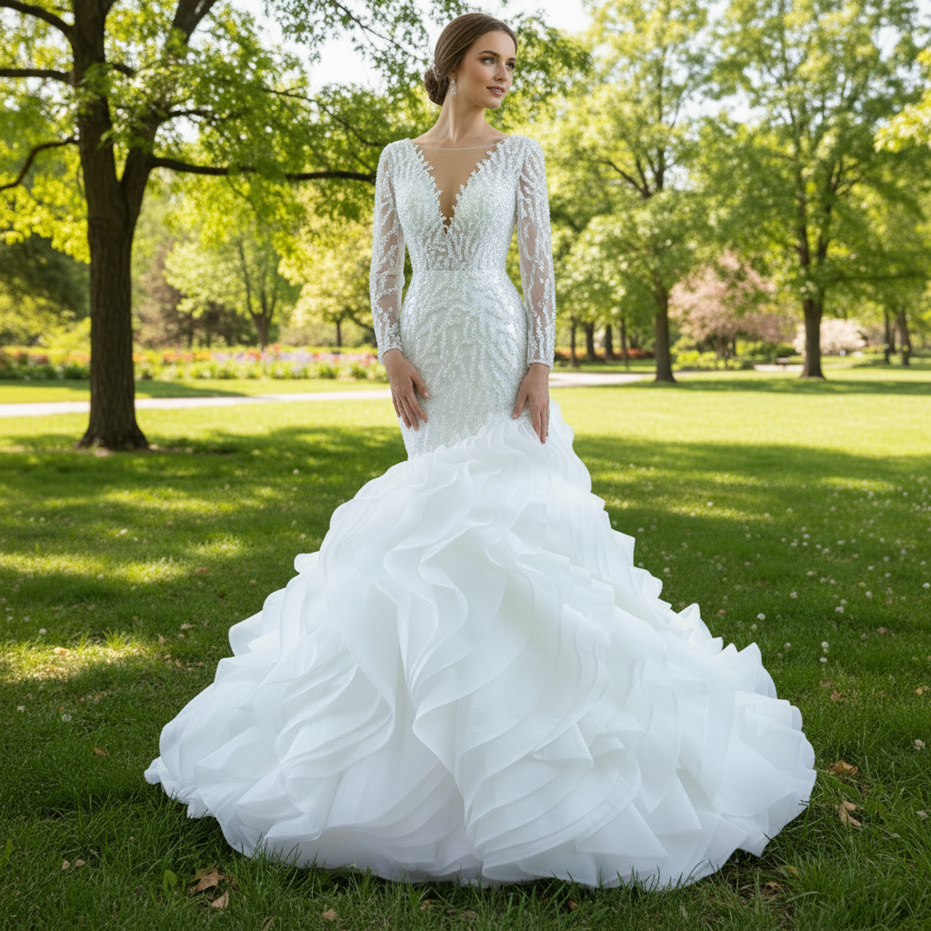 Adéntrate en un mundo donde la artesanía tradicional y el diseño contemporáneo se fusionan en perfecta armonía con este impresionante vestido de novia sirena de manga larga. Meticulosamente confeccionado por hábiles artesanos, este vestido representa la cumbre de la elegancia nupcial, con miles de perlas aplicadas a mano que adornan el corpiño con intrincados estampados florales, captando y reflejando la luz con cada delicado movimiento. La lujosa tela, seleccionada por su impecable caída y sutil brillo, envuelve tu figura con un delicado abrazo antes de caer en cascada sobre la magnífica falda de volantes multicapa del vestido.