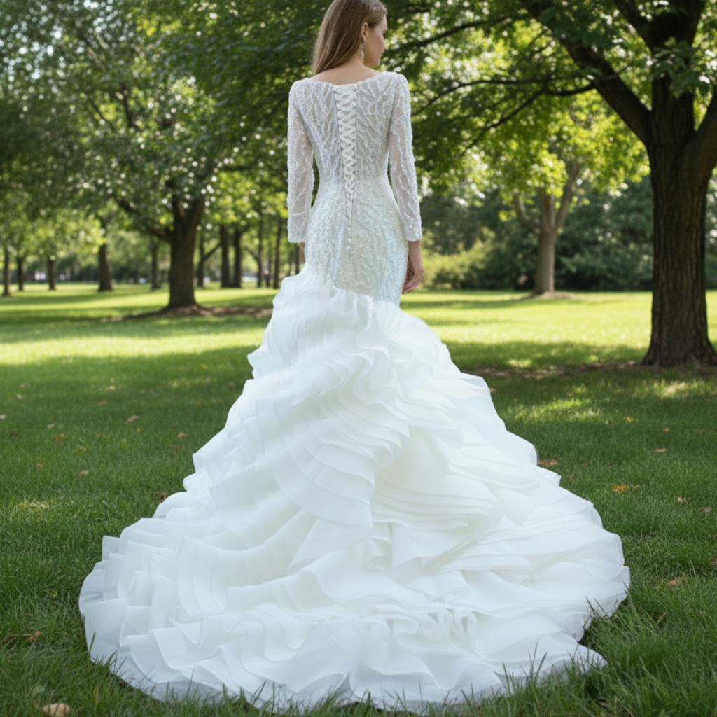 La magnífica falda del vestido narra la historia de una visión artística, con cada volante cortado y fruncido individualmente para crear un efecto cascada que fluye con gracia poética. Las lujosas capas de tela que lo recubren brindan integridad estructural a la vez que mantienen una comodidad ligera, permitiéndole moverse con fluidez durante toda la celebración. Las mangas largas, rematadas con delicados botones con incrustaciones de perlas en los puños, ofrecen modestia y un estilo sofisticado, lo que lo hace especialmente adecuado para ceremonias tradicionales y entornos religiosos.