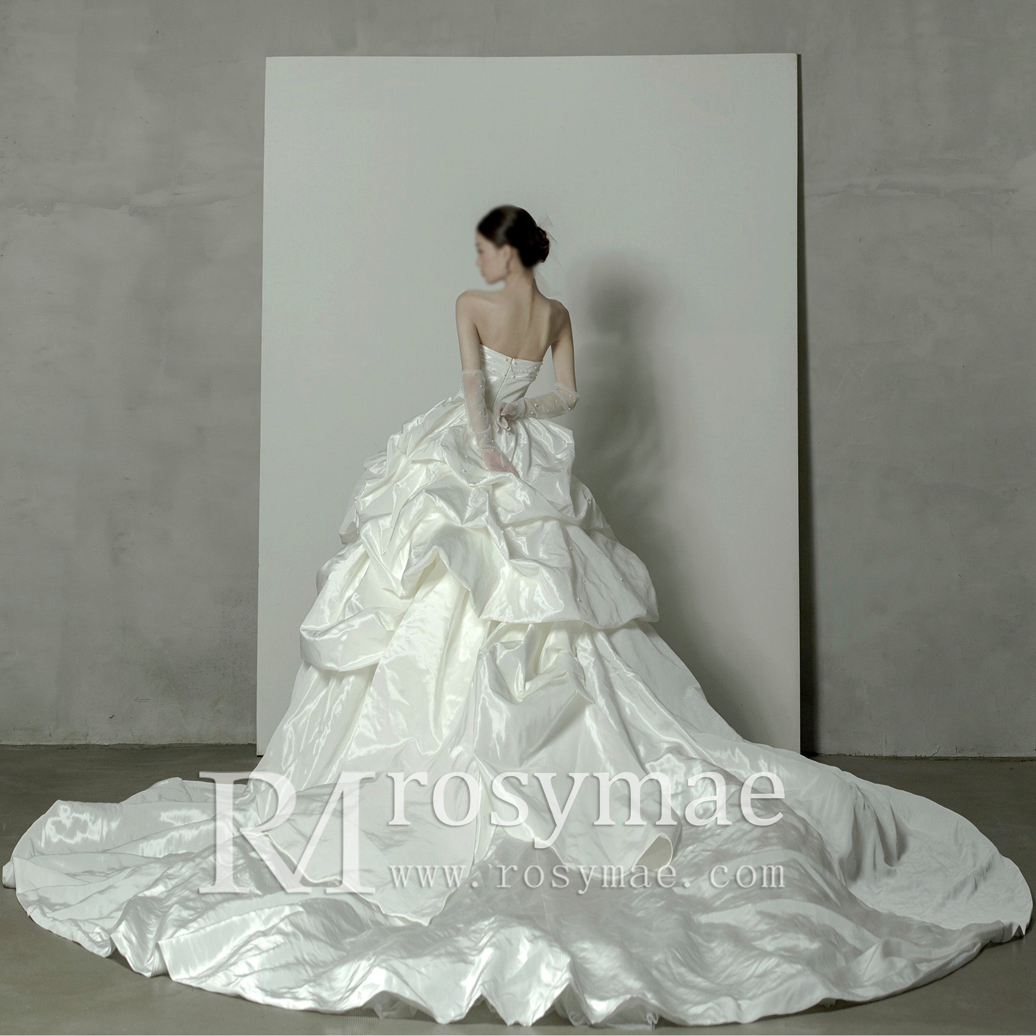 Prepárese para llamar la atención en su día especial con este vestido de novia de tafetán con cuello curvo. El elegante detalle de volantes y el escote barco añaden un toque de romance, mientras que la silueta del vestido de gala y la cola catedral irradian sofisticación. Con un impresionante escote en la espalda, te sentirás como una verdadera princesa caminando hacia el altar.