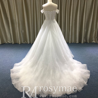 Off the Shoulder A-Line Wedding Gown with Tulle Flutter Sleeves