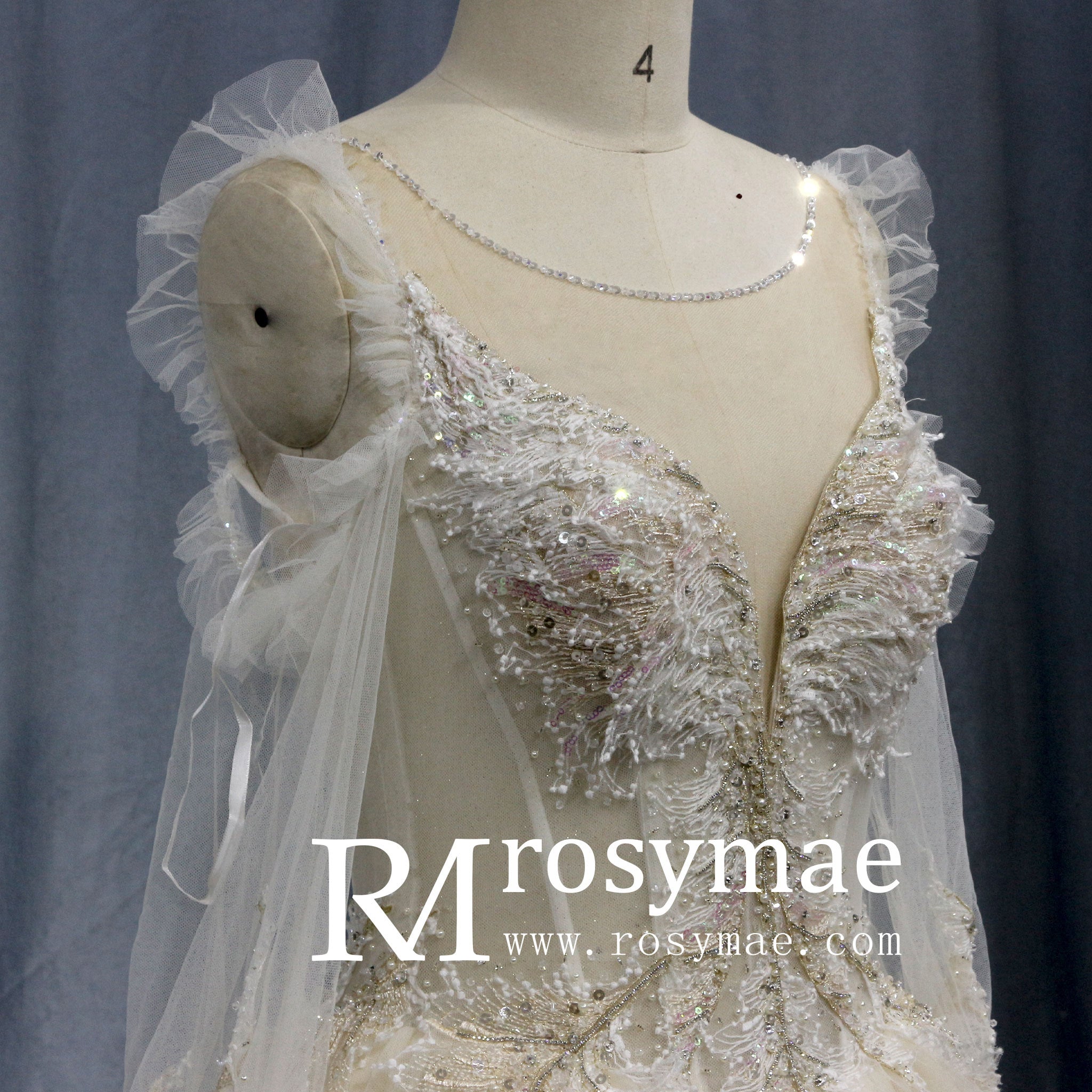 Este vestido de novia color champán claro con hombros descubiertos, manga larga transparente, escote en V profundo e ilusión, corpiño transparente con excelentes cuentas de perlas y espalda transparente con cola catedral.