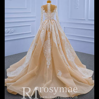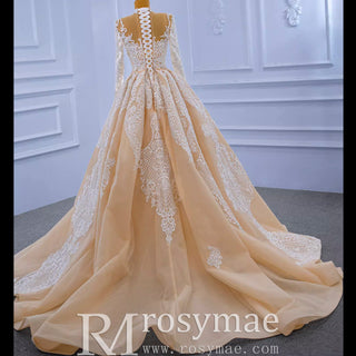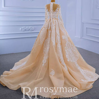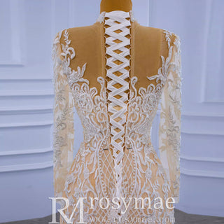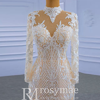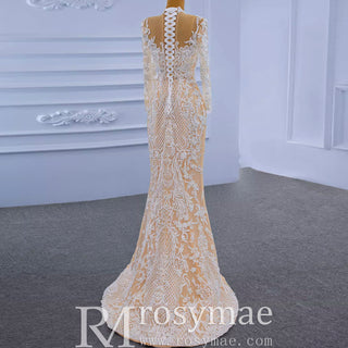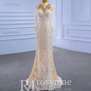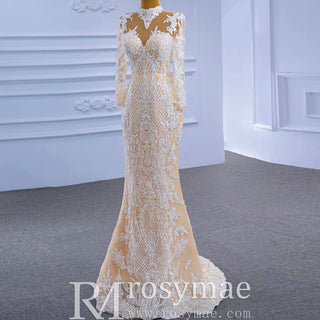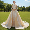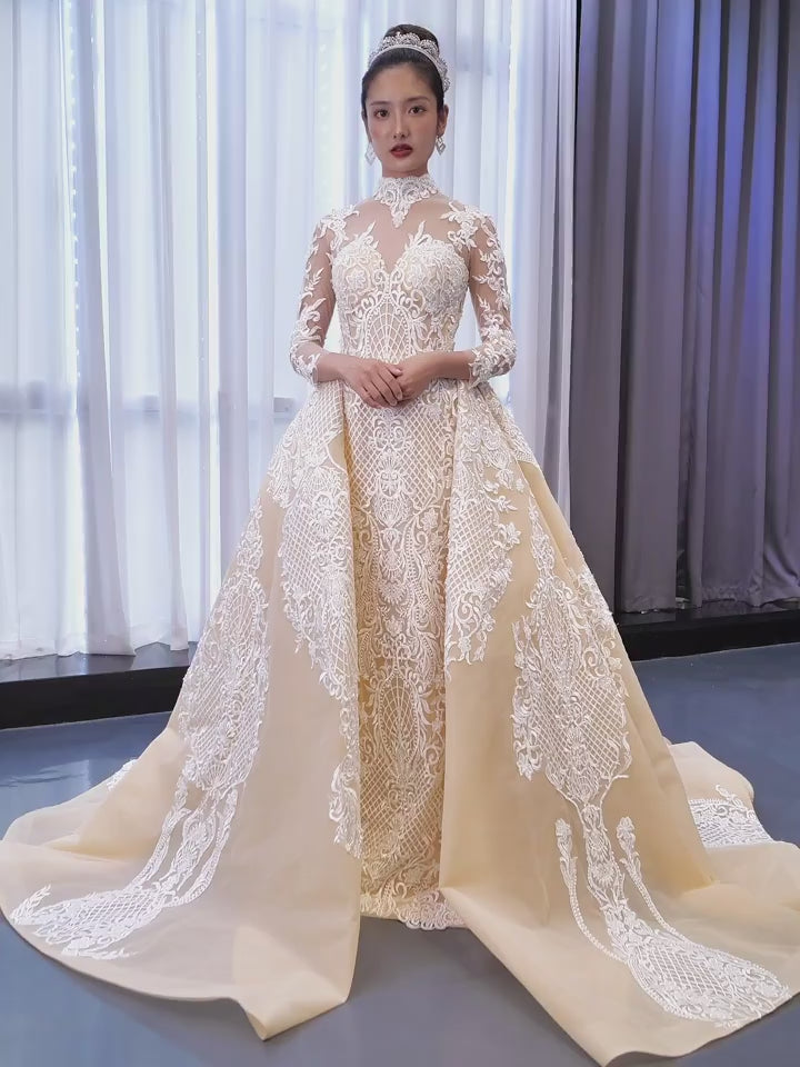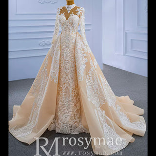 Vestido de novia de manga larga con cuello redondo y encaje de sirena con cola desmontable
