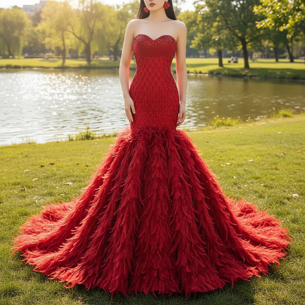 Eleva tu look de boda con este vestido de novia de lujo con forma de trompeta y escote corazón. Este vestido hecho a mano presenta un diseño único con escote palabra de honor y impresionantes detalles de plumas. El color rojo vibrante añade un toque de audacia, mientras que la cola de la capilla añade un toque de elegancia. ¡Una excelente opción para la novia que quiere llamar la atención en su día especial!