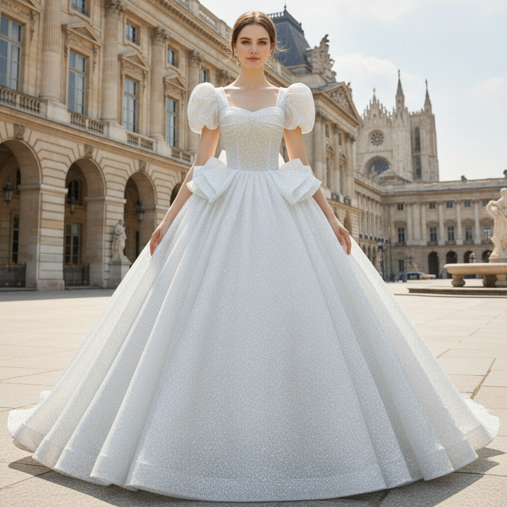Este exquisito vestido de novia estilo gala encarna la elegancia nupcial atemporal con su majestuoso escote reina Ana y mangas cortas que enmarcan los hombros con belleza. El brillante tejido plateado atrapa la luz desde todos los ángulos, garantizando que atraigas todas las miradas al caminar hacia el altar. El diseño sin espalda revela un impactante punto focal: un intrincado detalle de lazo en la espalda, mientras que el encantador volante delantero aporta una dimensión romántica y movimiento. Cada elemento está cuidadosamente diseñado para la novia que se niega a mimetizarse, creando una silueta de inspiración princesa que equilibra la sofisticación clásica con el glamour moderno. Perfecto para crear momentos inolvidables el día de tu boda.