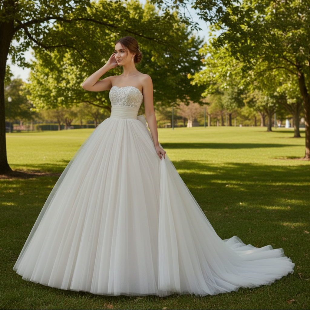 Vestido de novia de tul sin tirantes con perlas