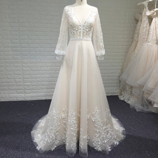Elegante vestido de novia de manga larga en color champán claro con escote en forma de cerradura en la espalda