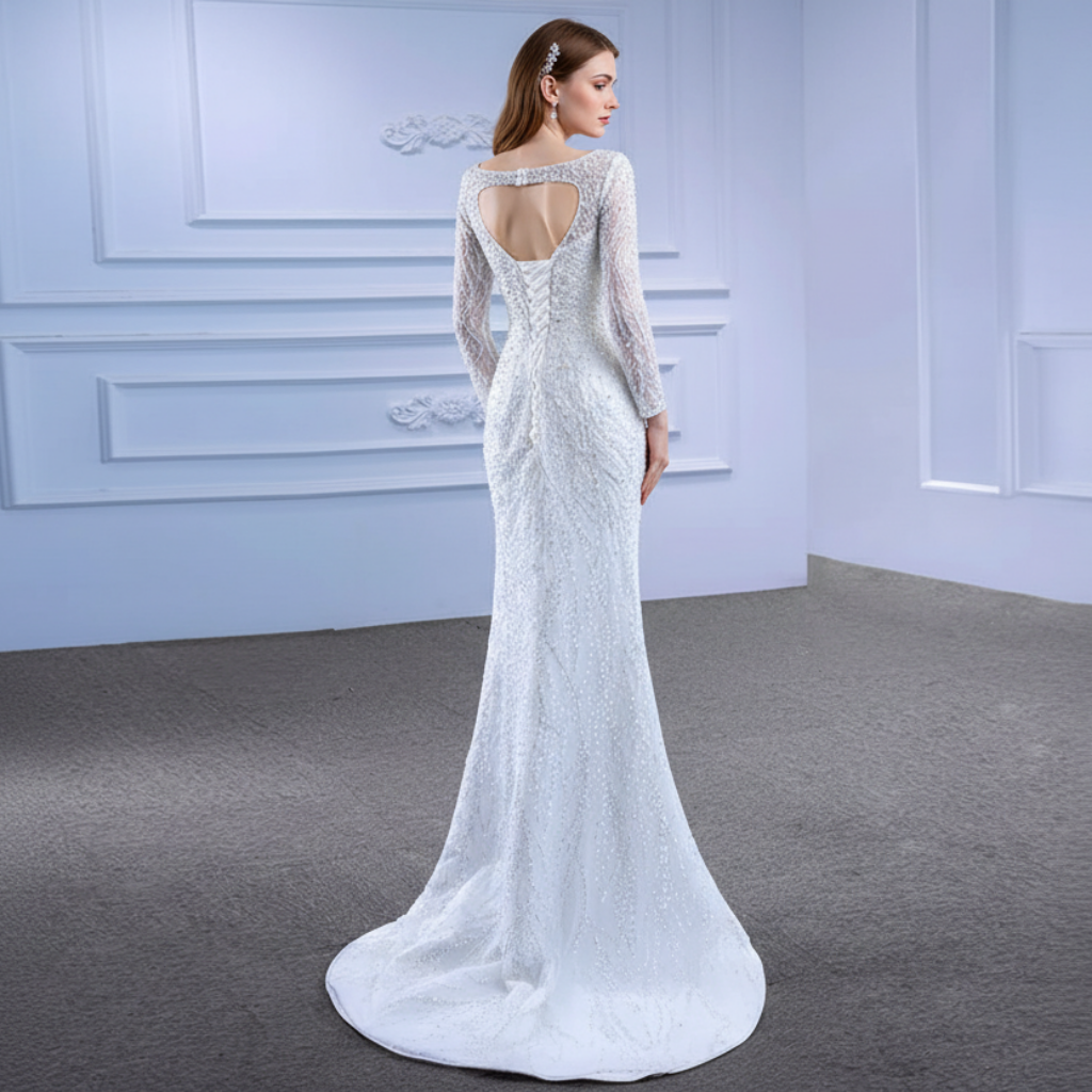 Disfrute de la mejor experiencia nupcial con este vestido de novia de manga larga con pedrería. El escote redondo transparente y la espalda en forma de cerradura con cierre de corsé destilan elegancia y romanticismo. La falda desmontable transforma el diseño del vestido de fiesta en un impresionante vestido de sirena, perfecto para la recepción. Con una cola catedral suelta, ¡este vestido te hará sentir como una princesa en tu día especial!