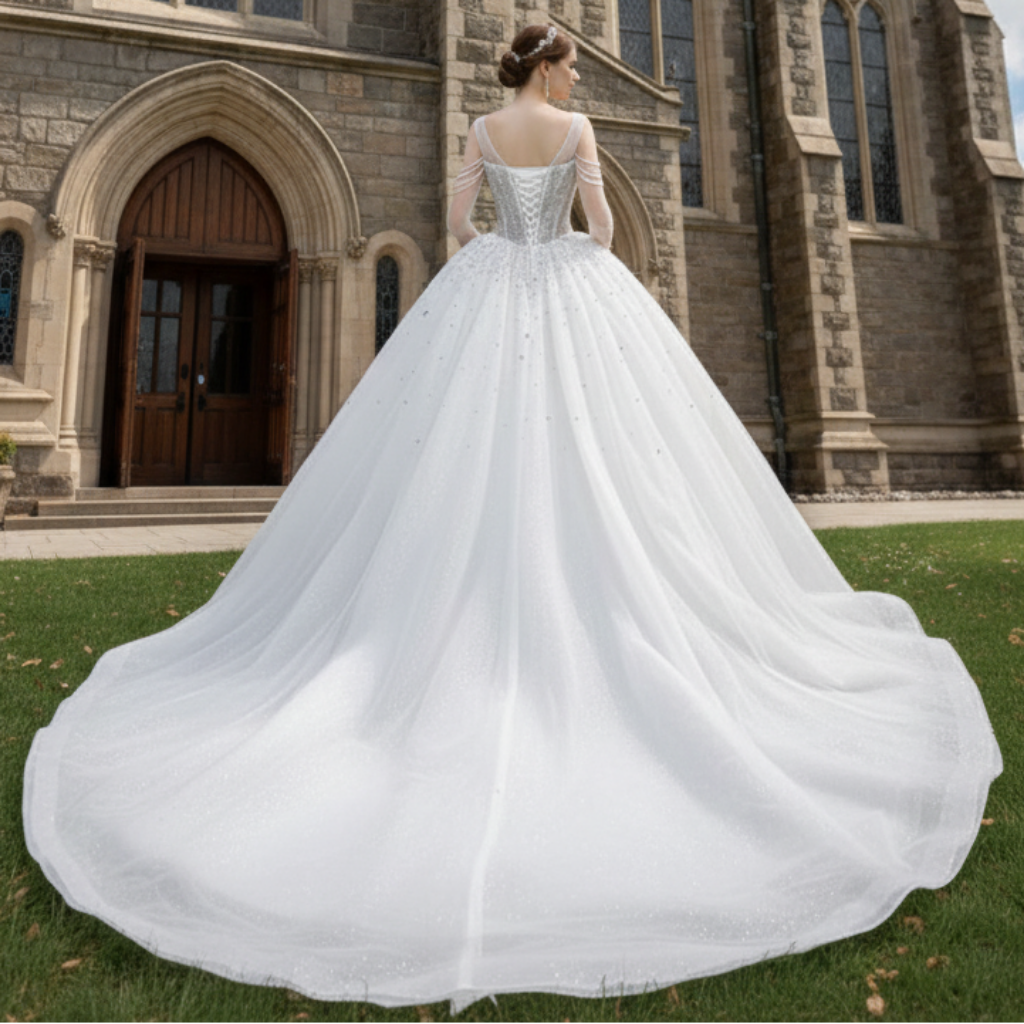 Este elegante vestido de novia es perfecto para una boda de lujo. El cuello cuadrado transparente y la espalda escotada aportan un toque de sofisticación, mientras que los adornos de cristal y la brillante organza crean un look impactante y glamuroso. Hecho a mano con atención al detalle, este vestido es de excelente calidad y presenta una cola catedral y una falda abullonada que le confieren un aspecto magnífico y majestuoso.