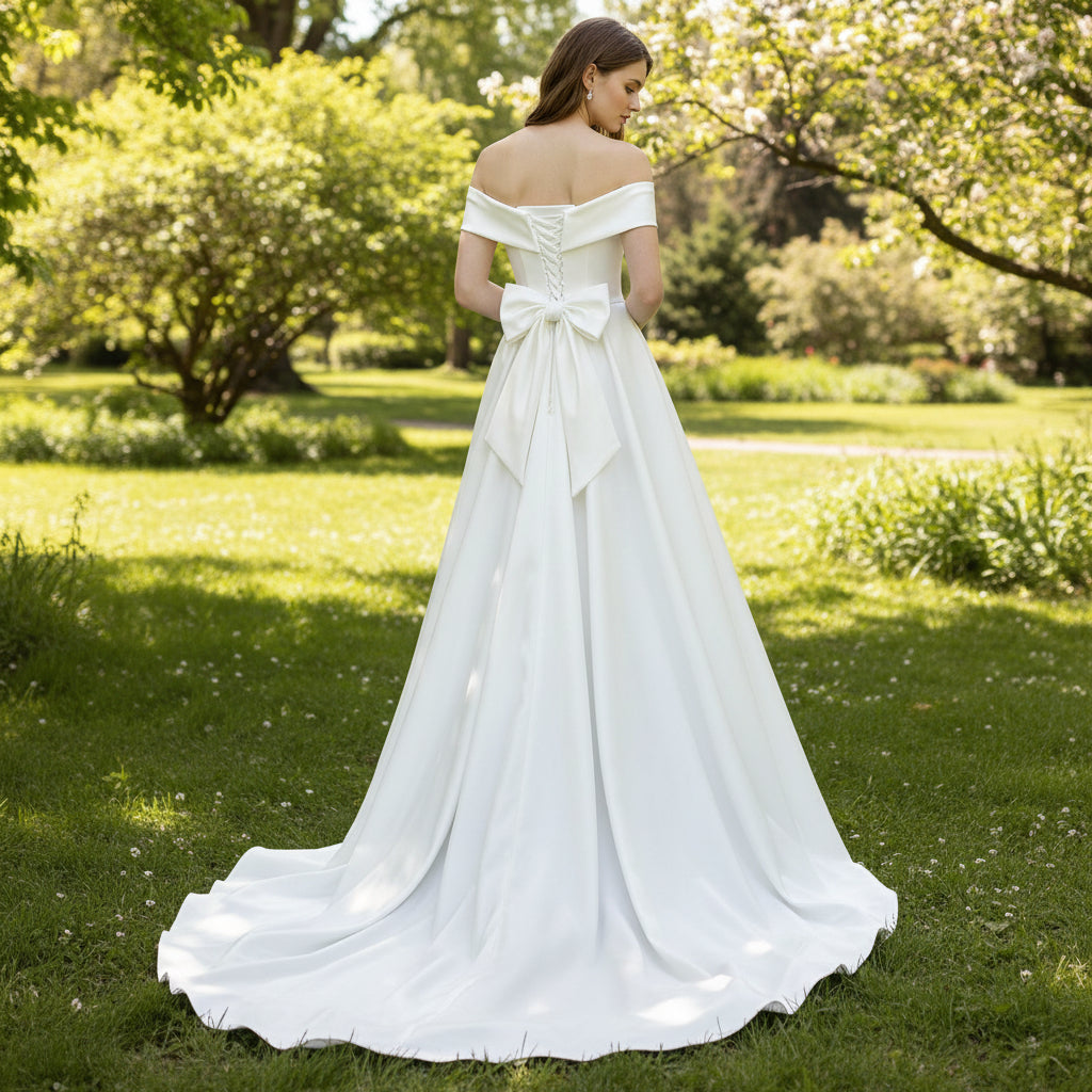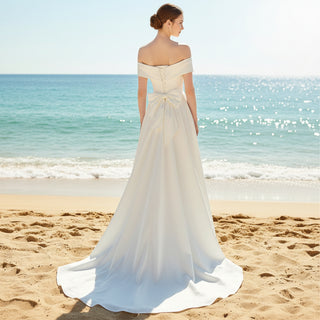 Este sencillo vestido de novia de satén presentaba una abertura en la pierna y una abertura para una fiesta de boda en la playa o al aire libre, un diseño sencillo y elegante con escote al descubierto, espalda media con lazo y cola tipo capilla.