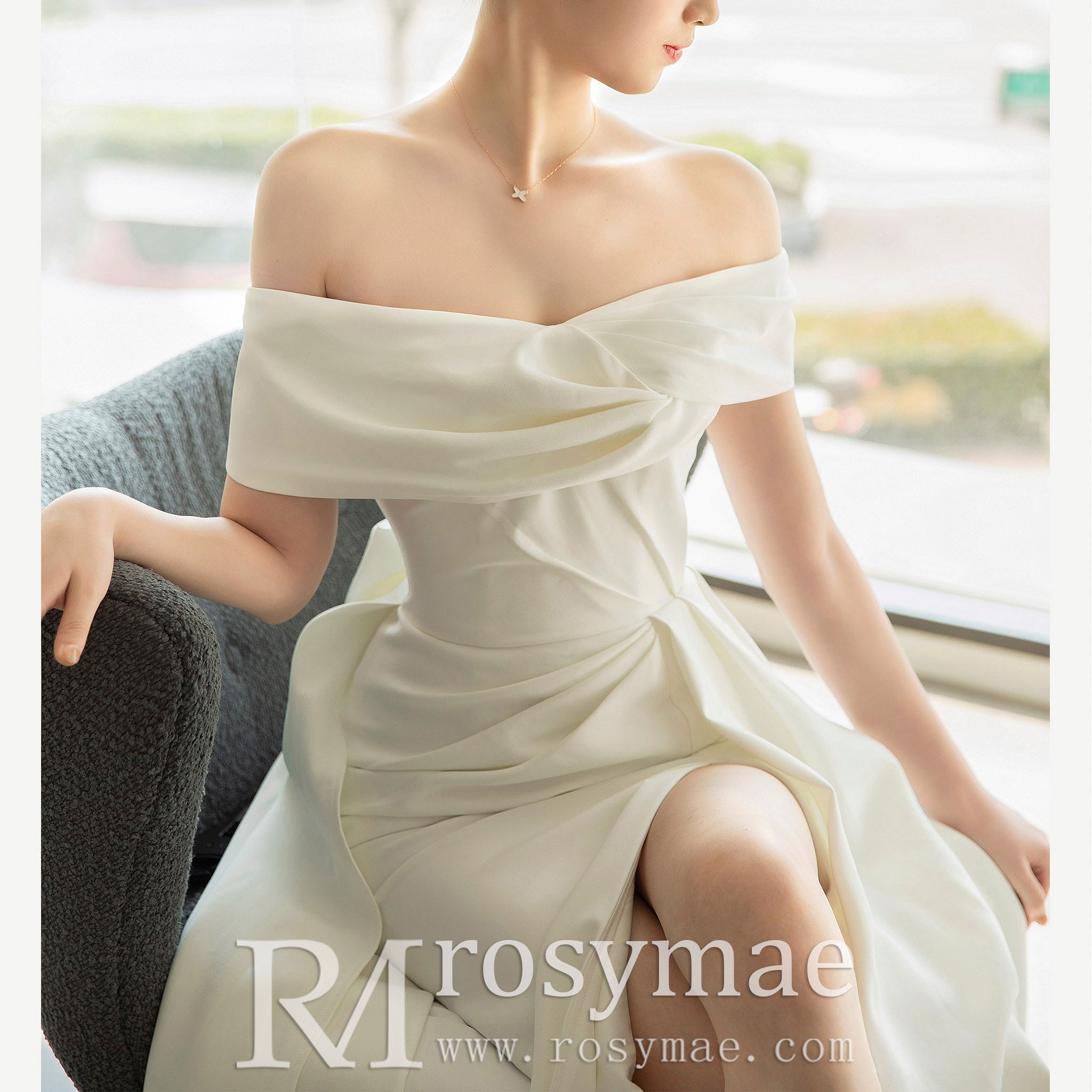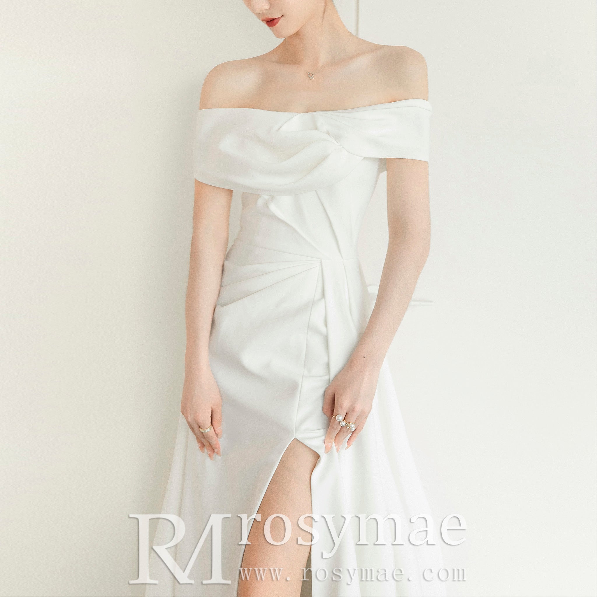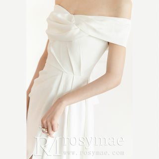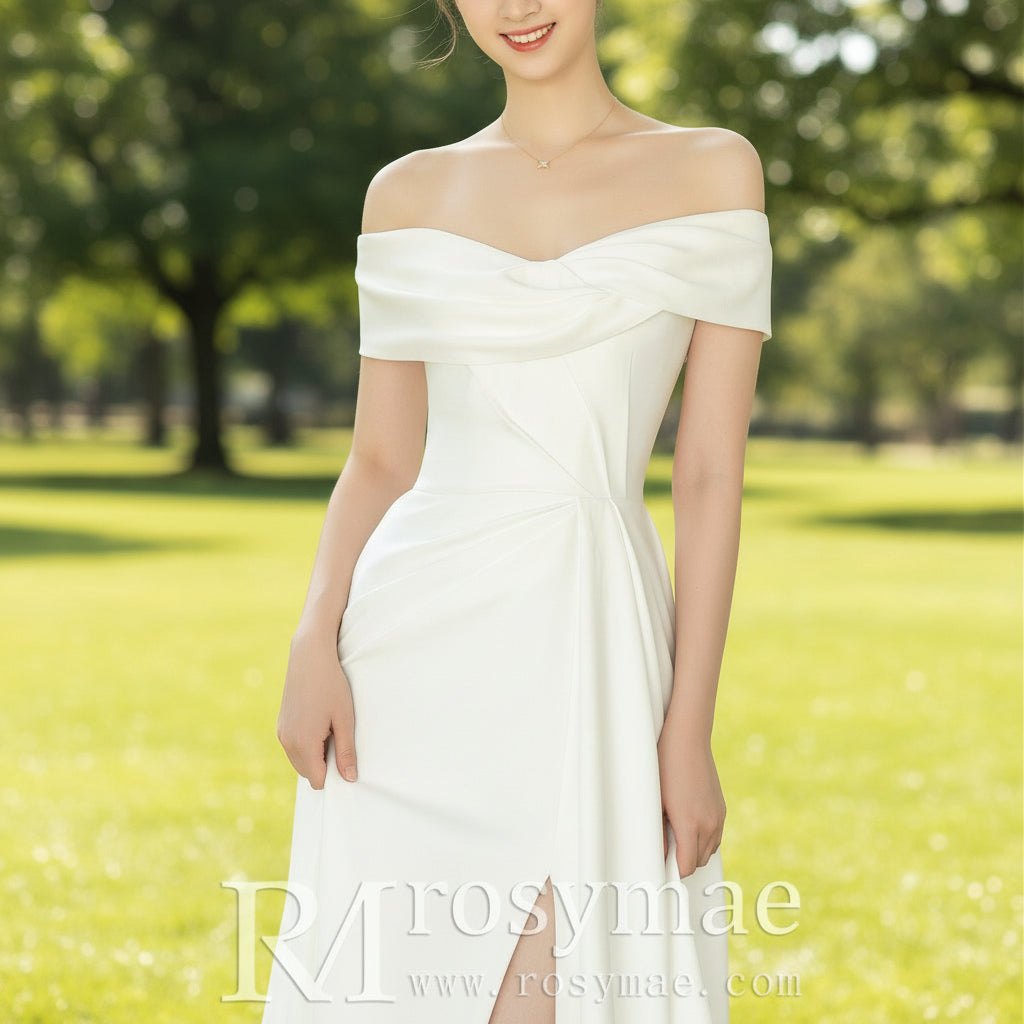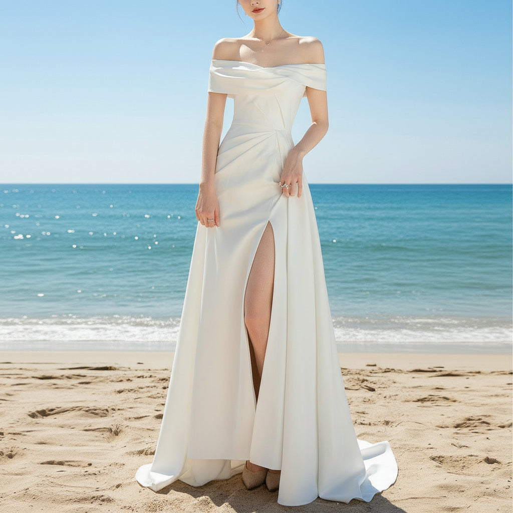 Vestido de novia de raso con abertura en la pierna y manga fuera del hombro