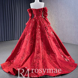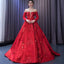 Este vestido de novia de alta gama presenta impresionantes lentejuelas rojas y apliques de flores de encaje, lo que crea un aspecto hermoso y elegante. Con un diseño sin tirantes ni mangas y una cola estilo catedral, este vestido de fiesta es perfecto para una novia elegante y glamurosa. El escote sin hombros le agrega un toque de romance a este vestido sin espalda. Haz una declaración en tu día especial con este vestido de novia rojo con apliques de encaje brillante.