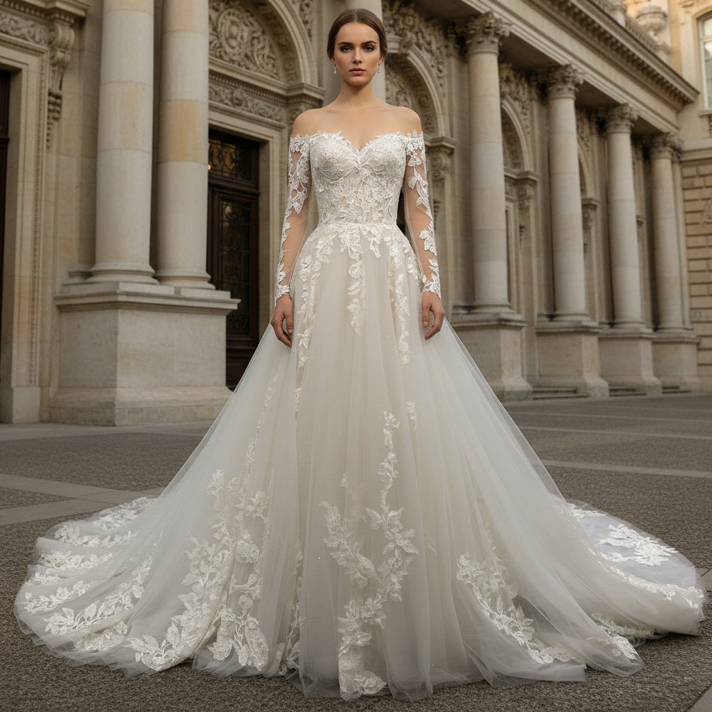 Realza tu boda con este exquisito vestido de corte A. Las aplicaciones de encaje vintage lucen una paleta multicolor, mientras que la falda de tul en capas le da un toque de fantasía. Las mangas largas transparentes y la espalda tipo corsé crean una silueta romántica, rematada con una impresionante cola capilla.