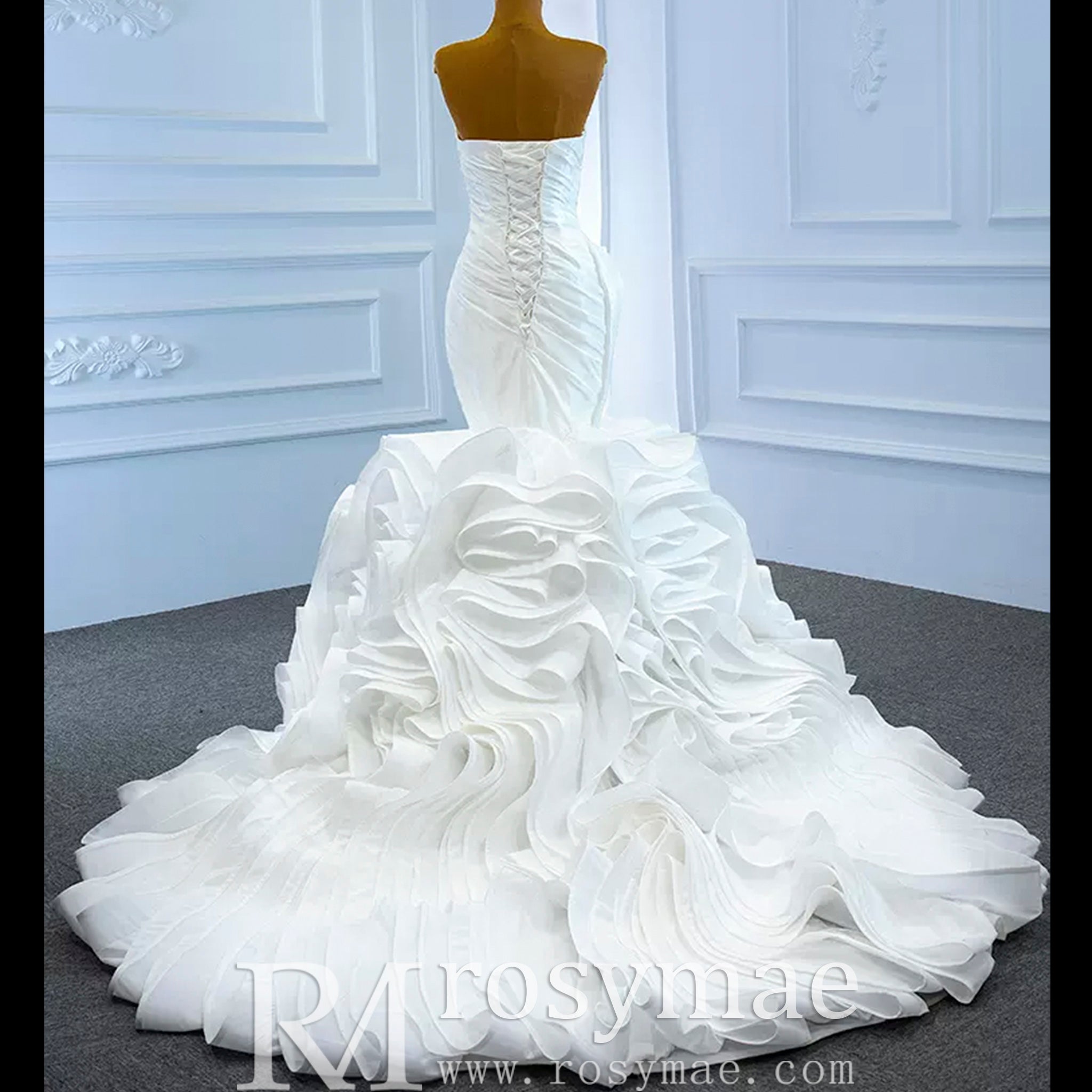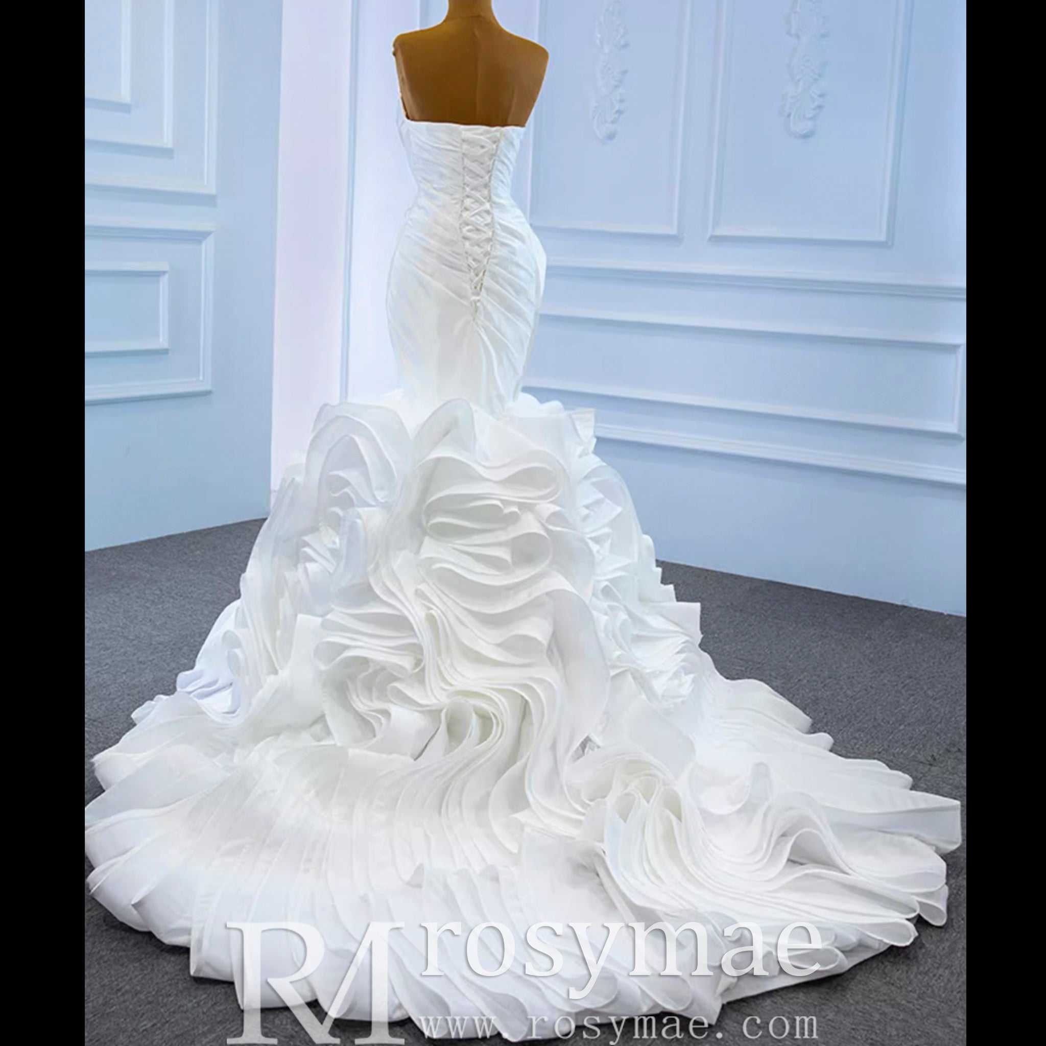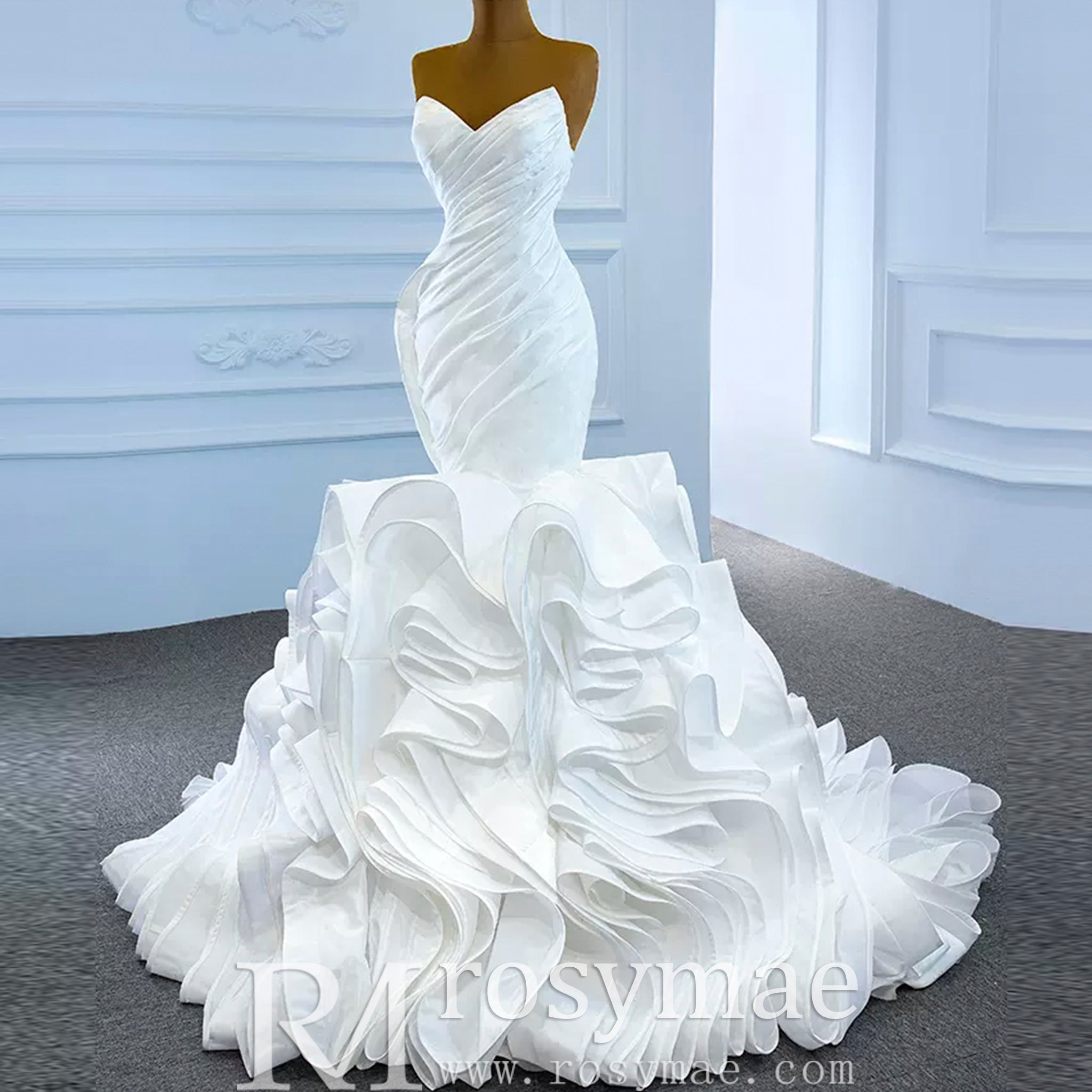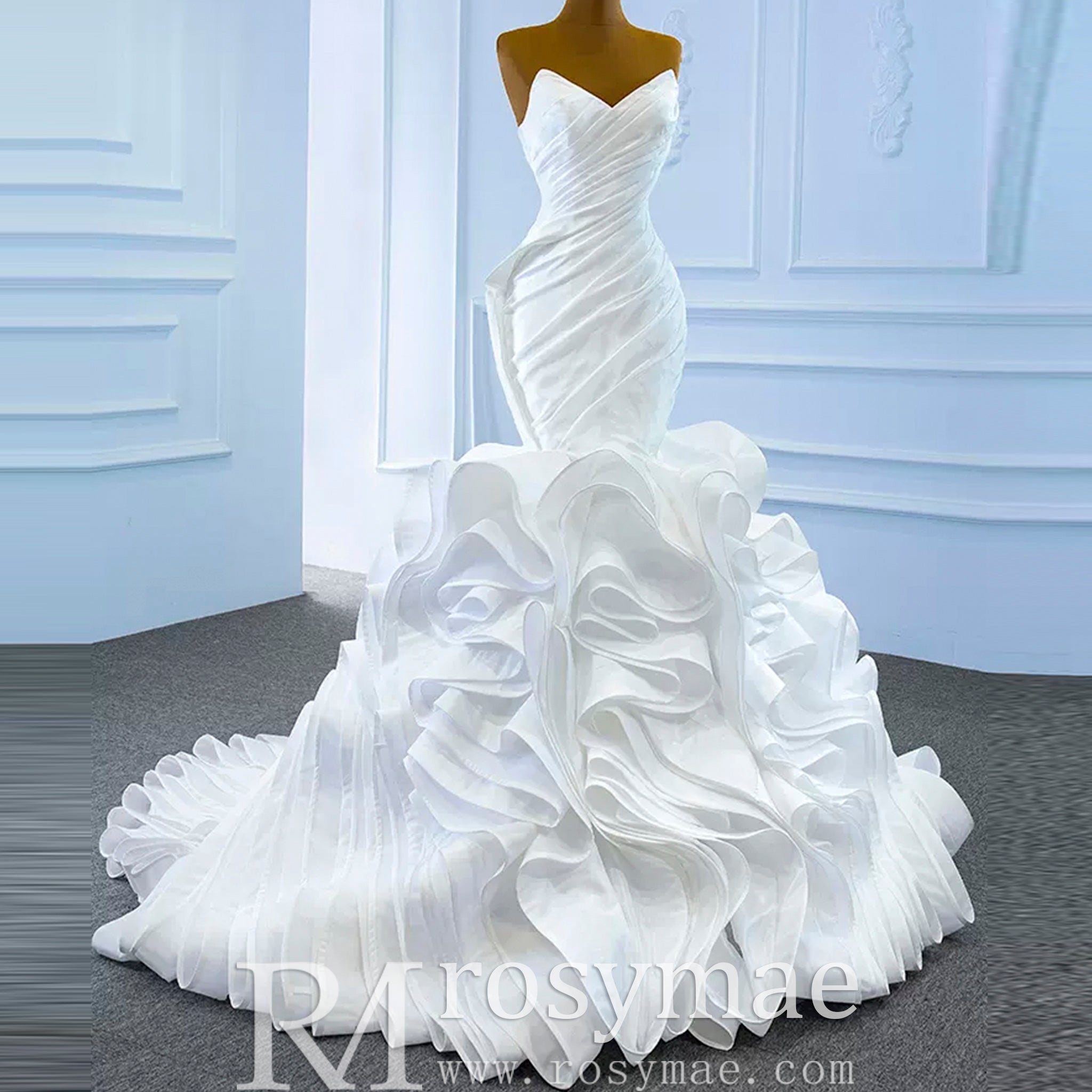 Vestido de novia de sirena con escote en V, fruncido y sin tirantes y falda con volantes