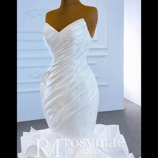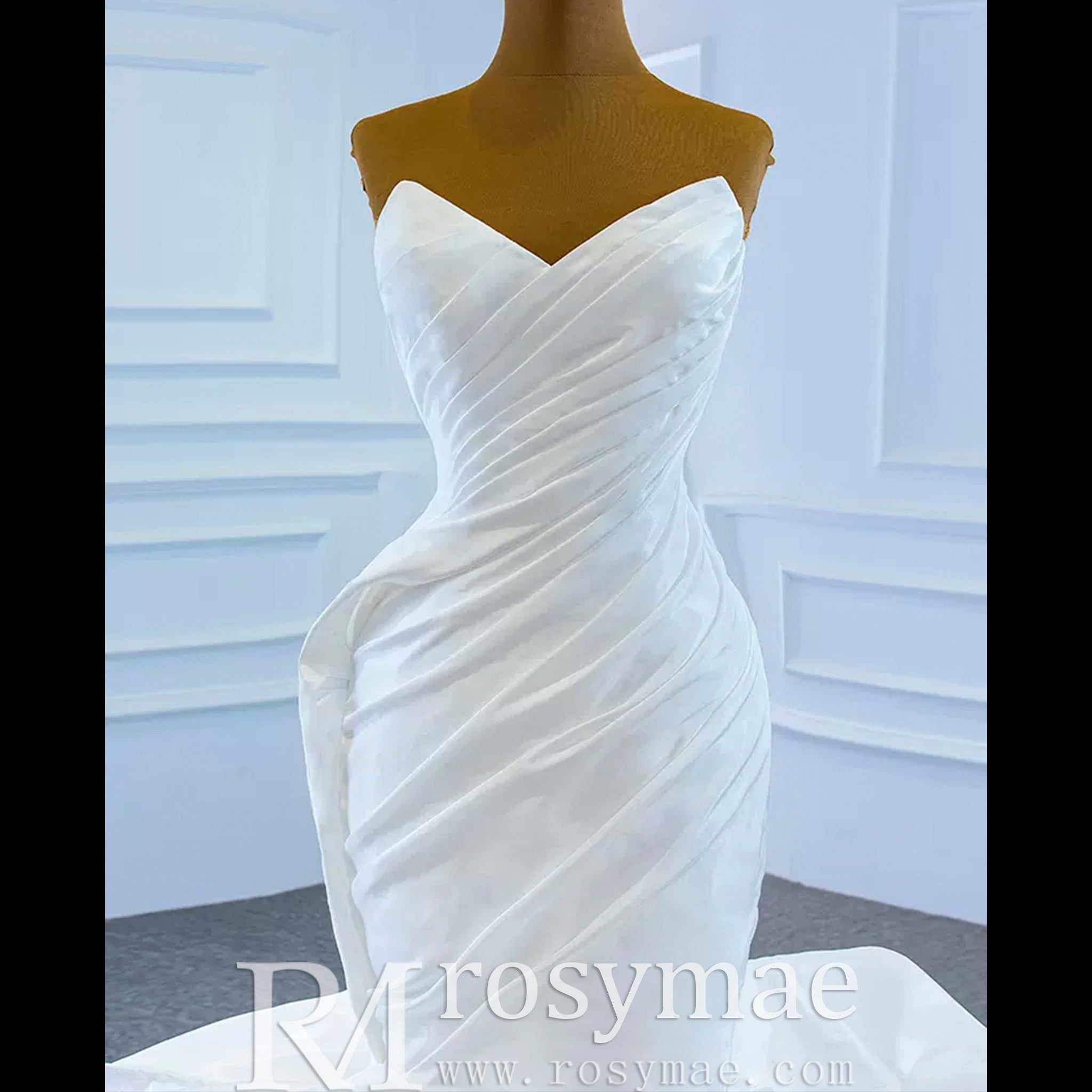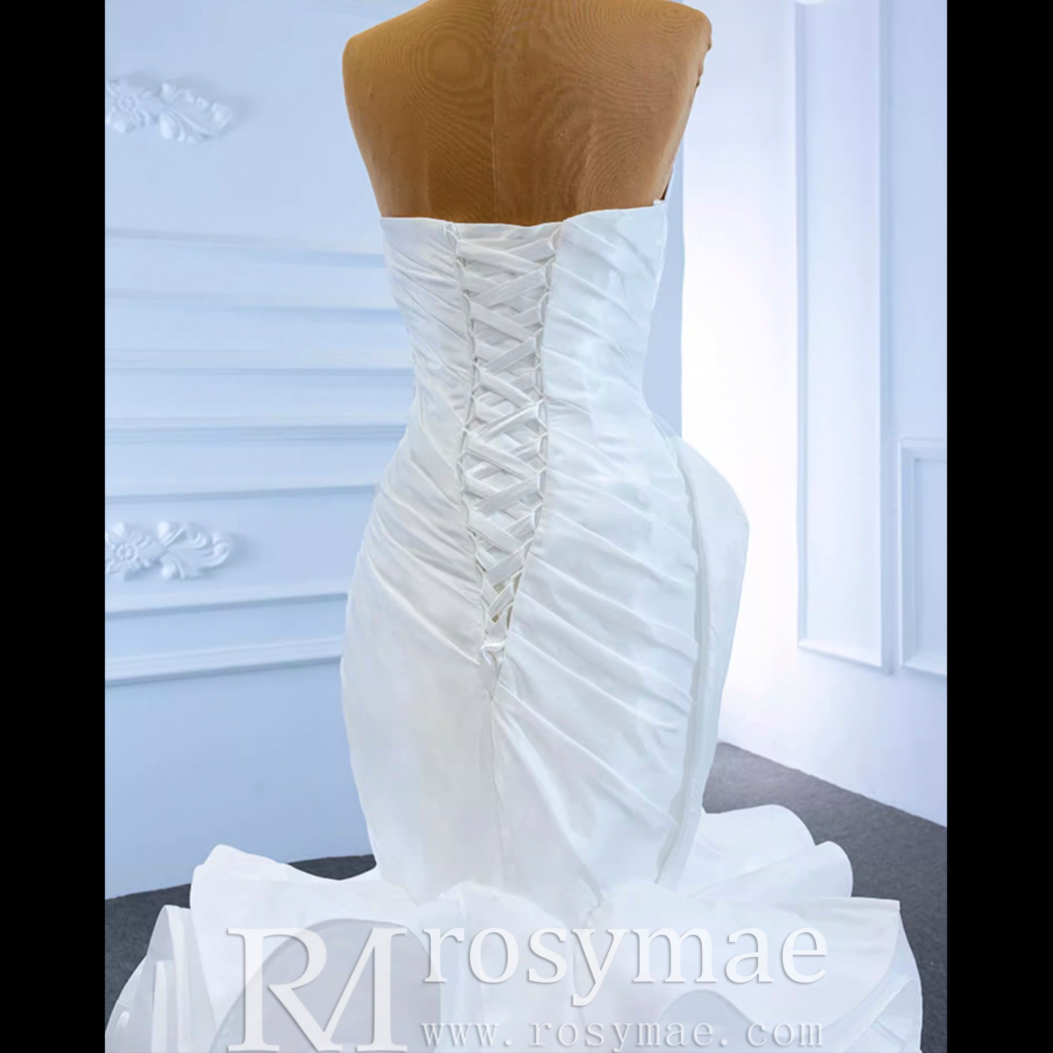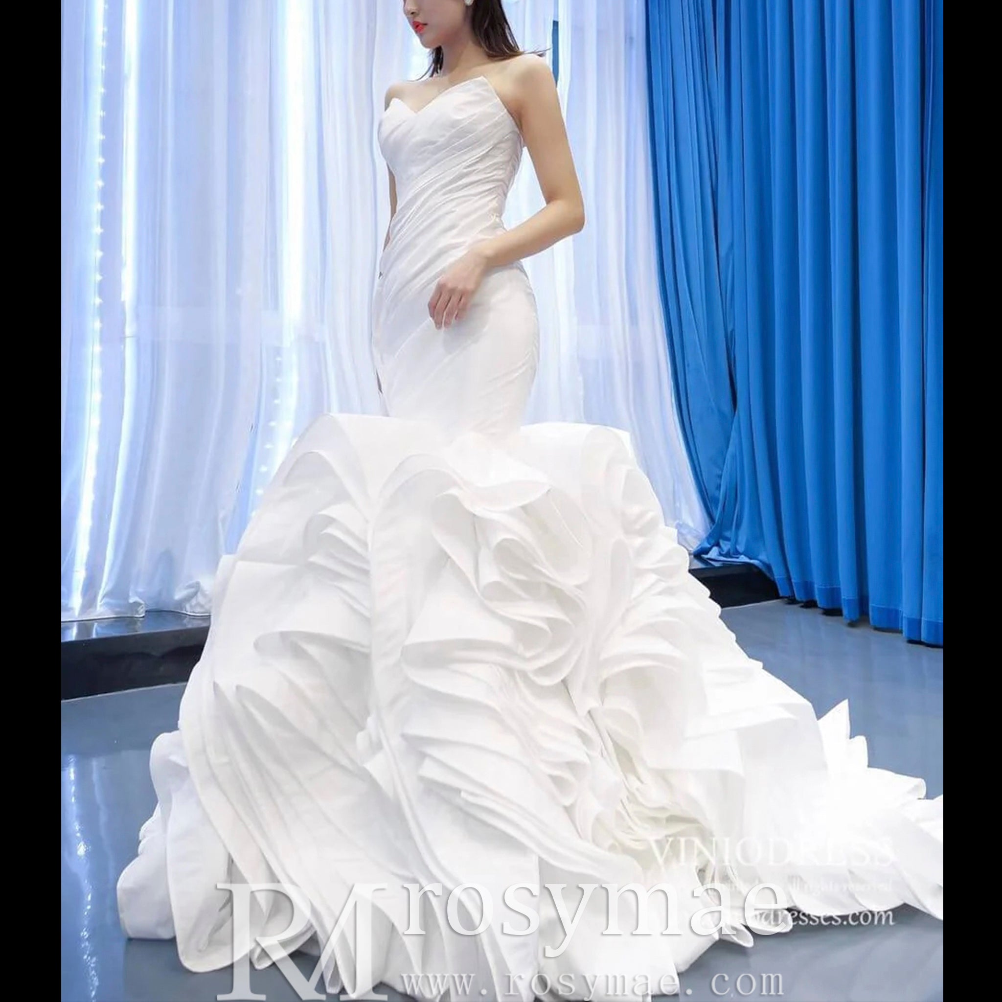 Vestido de novia de sirena con escote en V, fruncido y sin tirantes y falda con volantes