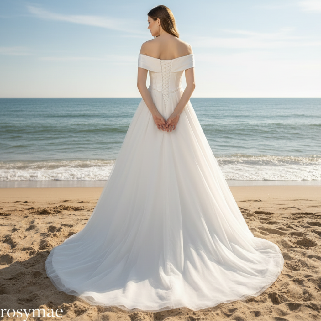 Este vestido de novia de corte A y hombros descubiertos combina una elegancia atemporal con un romanticismo contemporáneo. El lujoso corpiño de satén presenta un favorecedor escote que enmarca los hombros a la perfección, mientras que el delicado fruncido añade dimensión e interés visual. La fluida falda de tul crea una silueta etérea que se mueve con gracia a cada paso, perfecta tanto para la ceremonia como para la recepción. Su diseño de inspiración vintage evoca la estética nupcial clásica con un toque moderno, lo que lo convierte en la opción ideal para bodas campestres, ceremonias en jardines o celebraciones íntimas. El corte A favorece a diferentes tipos de cuerpo, manteniendo la elegancia estructurada que se espera de un vestido de novia formal. Ya sea que esté planeando una celebración rústica o un sofisticado evento al aire libre, este vestido ofrece la gracia y el refinamiento que toda novia merece en su día especial.
