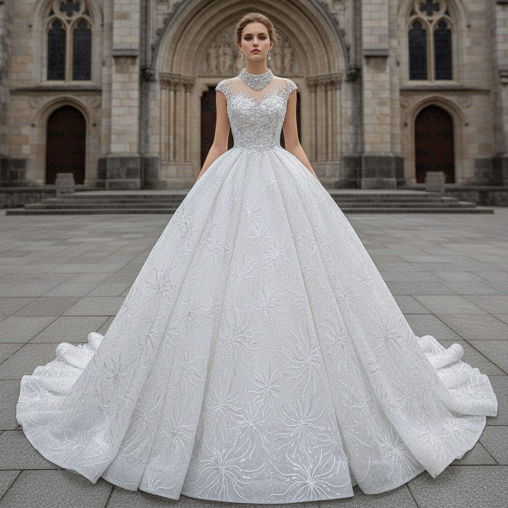 Adéntrate en un mundo de elegancia clásica con este exquisito vestido de novia hecho a mano, donde el encanto vintage se fusiona con la artesanía de lujo. El elegante escote en O alto enmarca tu rostro con belleza, mientras que el intrincado encaje floral y la delicada pedrería caen en cascada por el corpiño formando fascinantes patrones. La magnífica silueta del vestido de gala presenta una voluminosa falda abullonada, confeccionada con capas de tul de primera calidad que crea una presencia de cuento de hadas con cada movimiento.