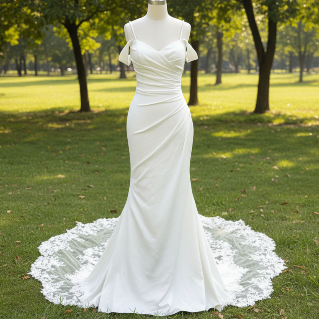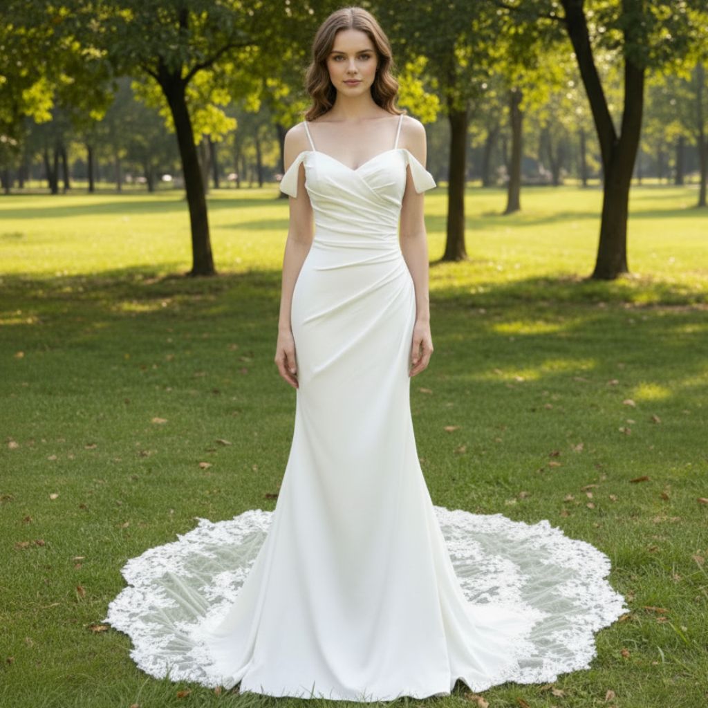 Vestido de novia asequible con tirantes finos de sirena y hombros descubiertos