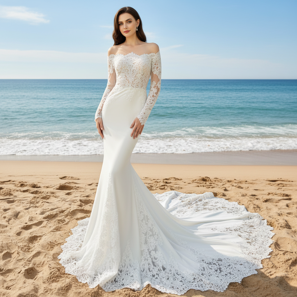 Este lujoso vestido de novia estilo sirena con corpiño transparente y con aplicaciones de encaje ilusión, falda suave y lisa, escote asimétrico con manga larga transparente y hombros descubiertos, este vestido de novia entallado y acampanado presentaba cola de pez en la espalda y cierre de cremallera con botones.