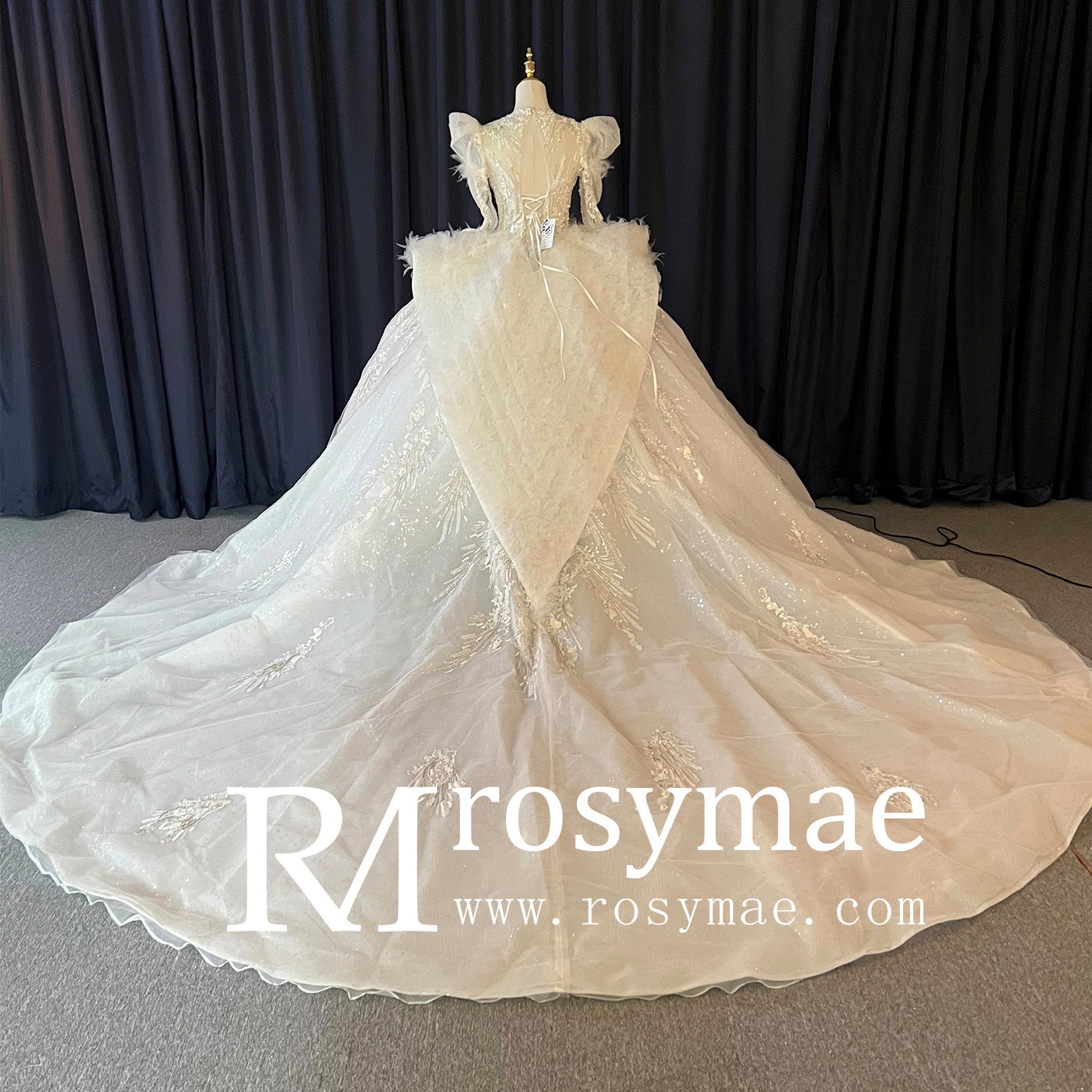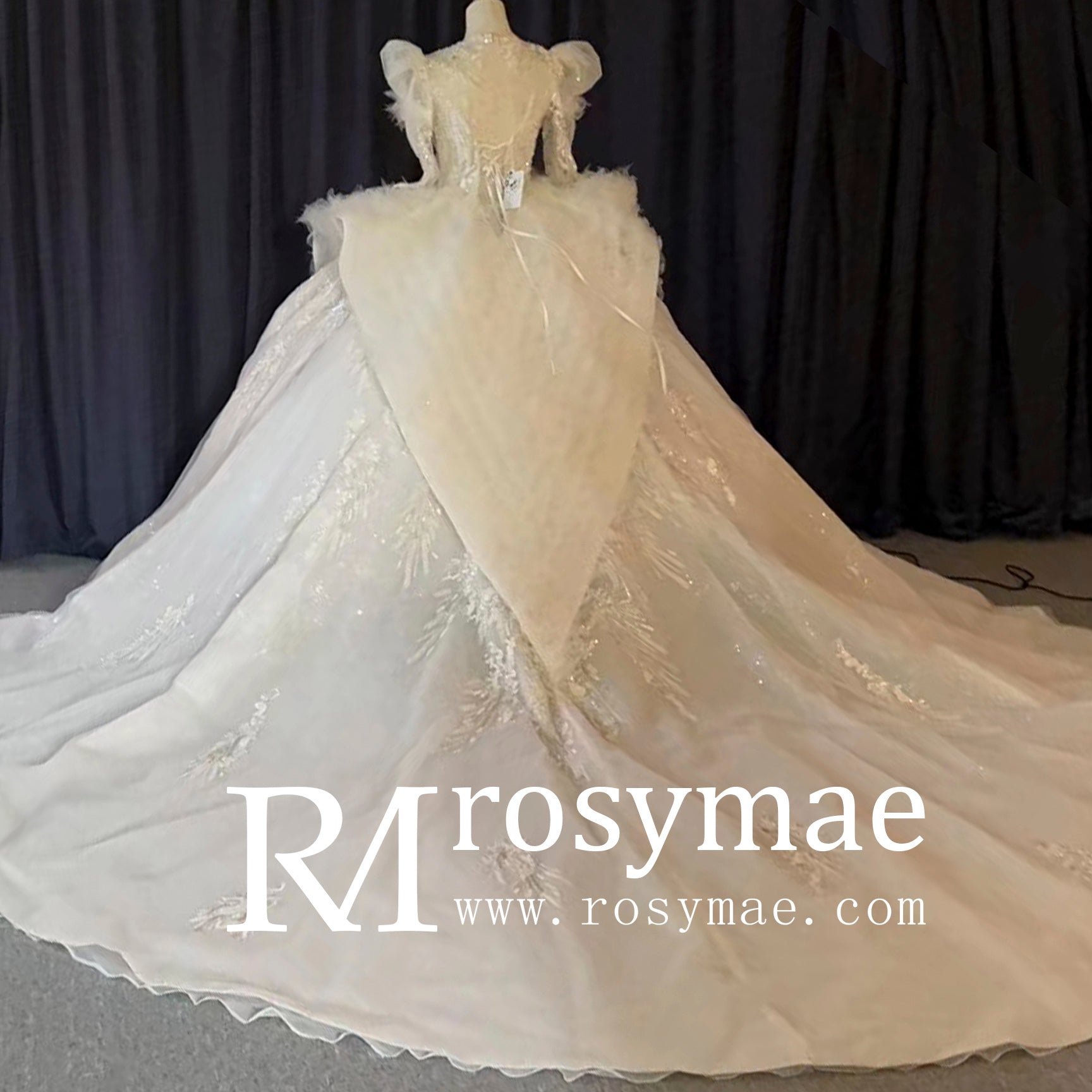 Este vestido de novia real y lujoso es el epítome de la elegancia y el refinamiento. El escote en V acentúa el magnífico diseño, mientras que la falda abullonada y la cola larga crean una silueta impresionante. Completa el look de boda de tus sueños con este vestido que rezuma sofisticación y gracia.