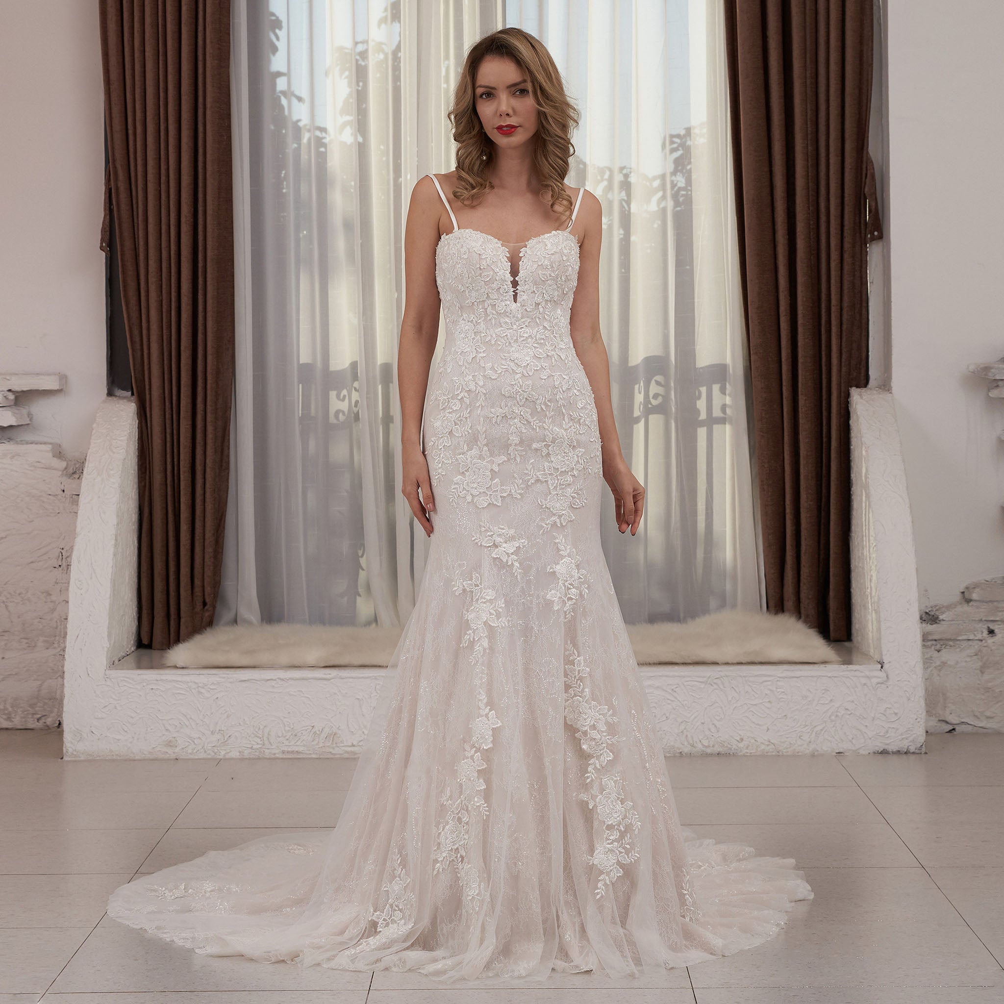 Vestido de novia de encaje de sirena con correa de espagueti modesta