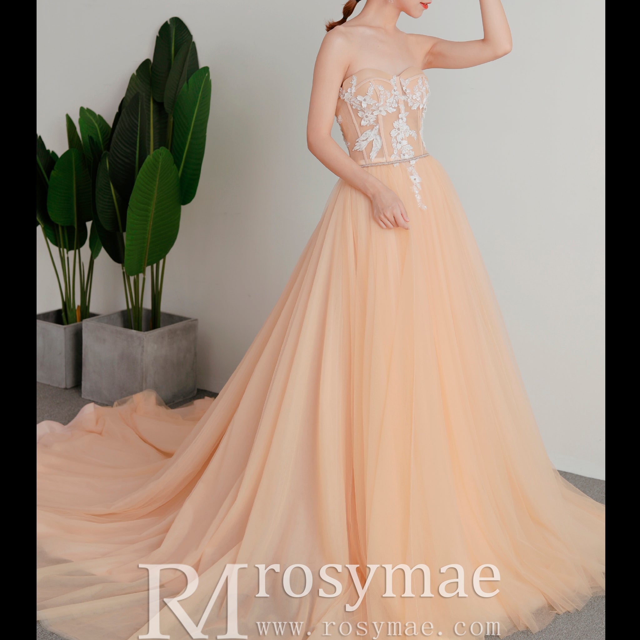 Este vestido de novia sin tirantes en color nude, confeccionado por expertos con flores 3D hechas a mano y cuentas brillantes, hará que cualquier novia brille en su día especial. La cola estilo capilla aporta elegancia, mientras que el tul ligero y de varios niveles proporciona comodidad y facilidad de movimiento. Perfecto para un look clásico pero moderno.
