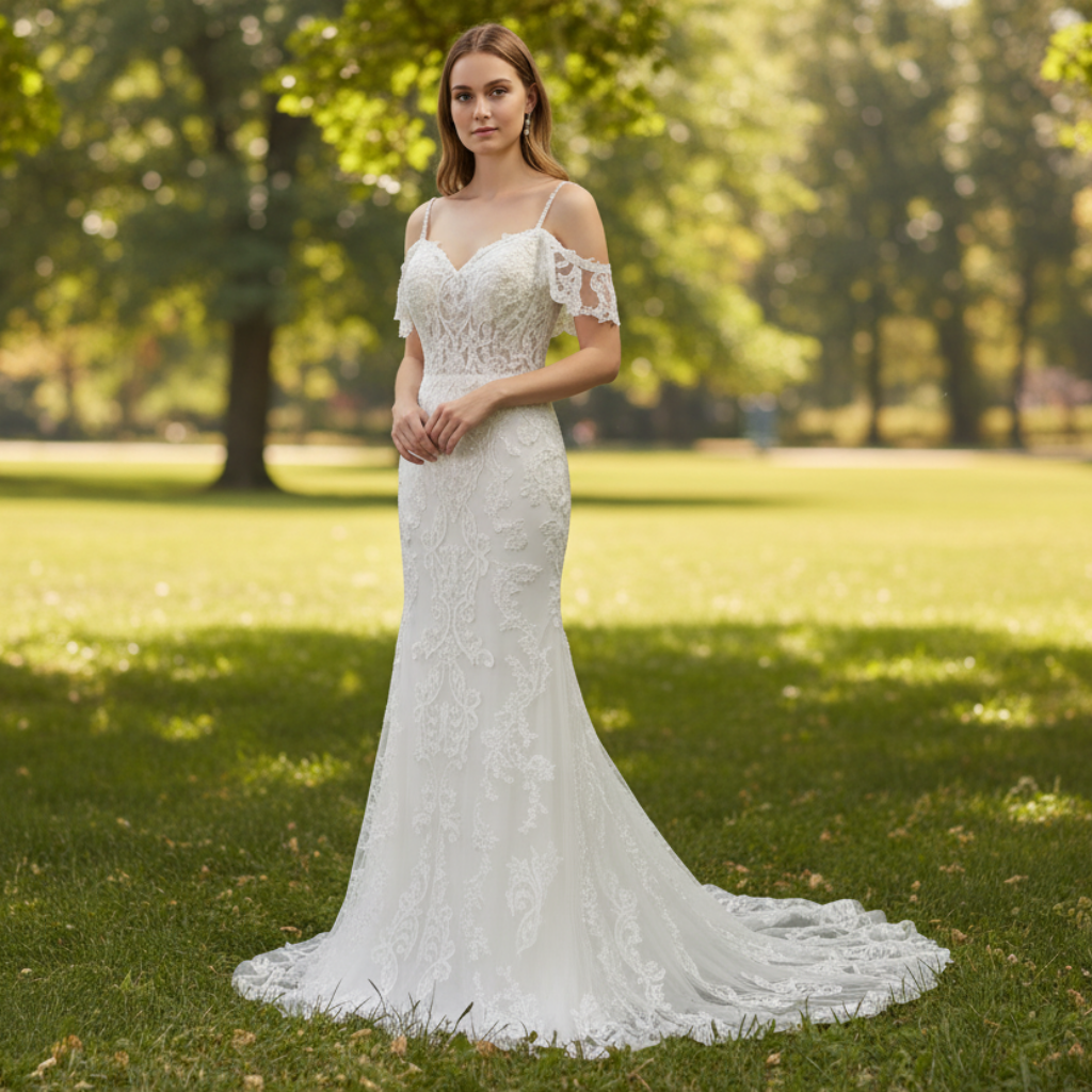 Este vestido de novia corte sirena con hombros descubiertos y falda acampanada combina a la perfección la elegancia atemporal con la sofisticación moderna. El escote corazón, delicadamente realzado por tirantes ilusión, destaca tu escote con un atractivo sutil, mientras que el corpiño estilo corsé con cuentas moldea tu torso, brindando brillo y una sujeción estructurada. Intrincados apliques de encaje floral recorren todo el vestido, adornados con cuentas y lentejuelas brillantes que captan la luz de forma hermosa, creando una textura lujosa que deslumbra desde todos los ángulos. La falda ajustada ciñe tus caderas y muslos, acentuando tus curvas antes de abrirse con gracia a la altura de la rodilla en una cola transparente con ribete de encaje que añade un toque romántico y dinámico a tu entrada. Diseñado para la novia que desea un look glamuroso sin esfuerzo, este vestido combina el romanticismo clásico con un estilo contemporáneo, asegurando que te sientas radiante, segura e inolvidable mientras celebras tu día especial desde los votos hasta el último baile.