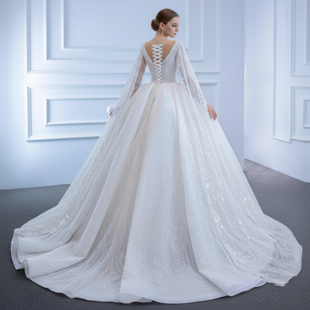 La voluminosa falda del vestido, con capas de tul de primera calidad y una sutil cola, ofrece una silueta de ensueño, ideal para un evento de la realeza. La espalda de corsé estructurada, forrada con cintas de satén y ballenas flexibles, garantiza un ajuste impecable y cómodo, mientras que el escote alto y las mangas amplias ofrecen una elegante cobertura para ceremonias discretas. Ya sea que esté planeando una celebración de inspiración vintage, una boda en un palacio o una ceremonia tradicional atemporal, esta obra maestra de alta costura le hará sentir como una reina.