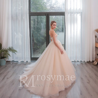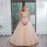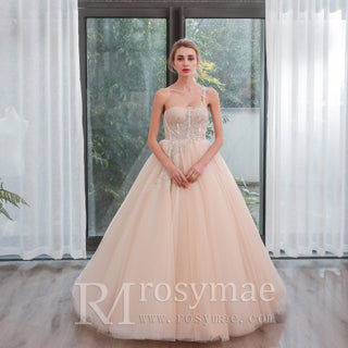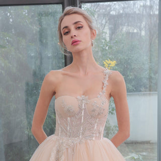 Este precioso vestido de novia presenta una sola tira y una falda abullonada, creando una impresionante silueta de vestido de fiesta. El color ruborizado y los intrincados apliques de encaje añaden un toque de elegancia y romance a esta hermosa pieza. Perfecto para cualquier novia que busque un look atemporal e inolvidable.