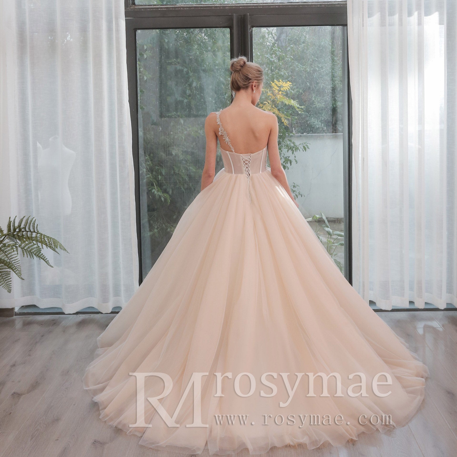 Vestido de novia con falda hinchada de encaje con apliques de un hombro