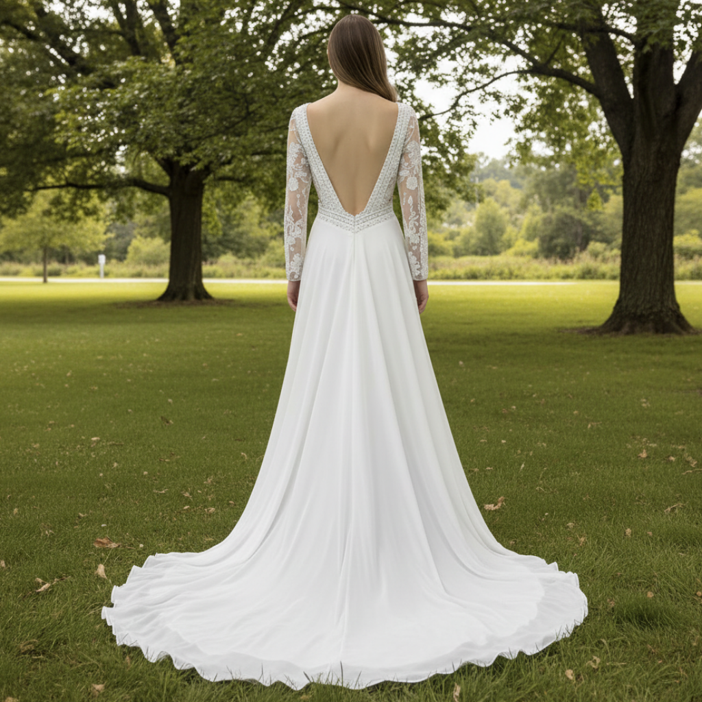 Luce radiante en el día de tu boda con el vestido de novia de corte recto, manga larga y escote en V con encaje, una magistral fusión de elegancia atemporal y sofisticación contemporánea. Este vestido está diseñado para realzar tus curvas naturales con su elegante silueta, ofreciendo un ajuste refinado y favorecedor que realza tu figura sin esfuerzo. Los delicados adornos de encaje en las mangas largas añaden una belleza intrincada, que se extiende con fluidez hasta una atractiva espalda descubierta que ofrece un sutil toque de sensualidad sin perder su encanto clásico. El escote en V de suave caída enmarca el escote con elegante sencillez, complementando a la perfección el detallado encaje para crear un look equilibrado y armonioso. Diseñado para brindar comodidad y un estilo duradero, este vestido te asegura que te sentirás tan espectacular como te ves en cada momento de tu celebración. Ya sea intercambiando votos o bailando hasta el amanecer, este vestido personifica la gracia, el romance y un atractivo cautivador que hará que tu día especial sea verdaderamente inolvidable. Haz una declaración de belleza atemporal y abraza la confianza que te brinda un vestido tan extraordinario como tu historia de amor.