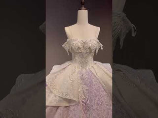 ¡Eleva el día de tu boda con este impresionante vestido de novia grande e hinchado de colores hecho a mano! Este vestido único en su tipo presenta cristales y perlas brillantes, creando un efecto fascinante mientras caminas por el pasillo. Los colores marfil y lila añaden un toque de romance, mientras que el diseño con volantes y el escote con hombros descubiertos irradian elegancia. ¡Completo con espalda escotada y cola larga, este vestido te hará sentir como una verdadera princesa en tu día especial!