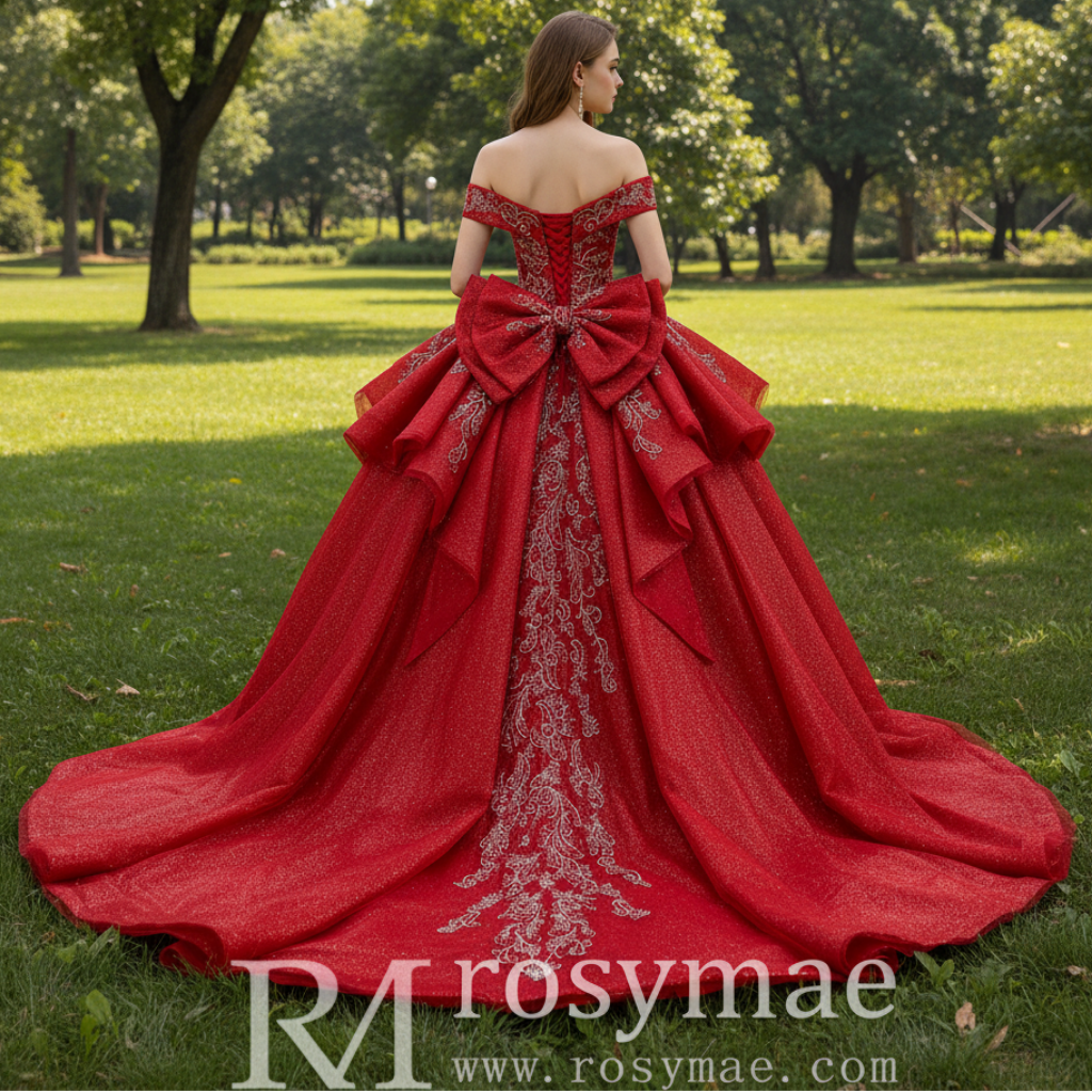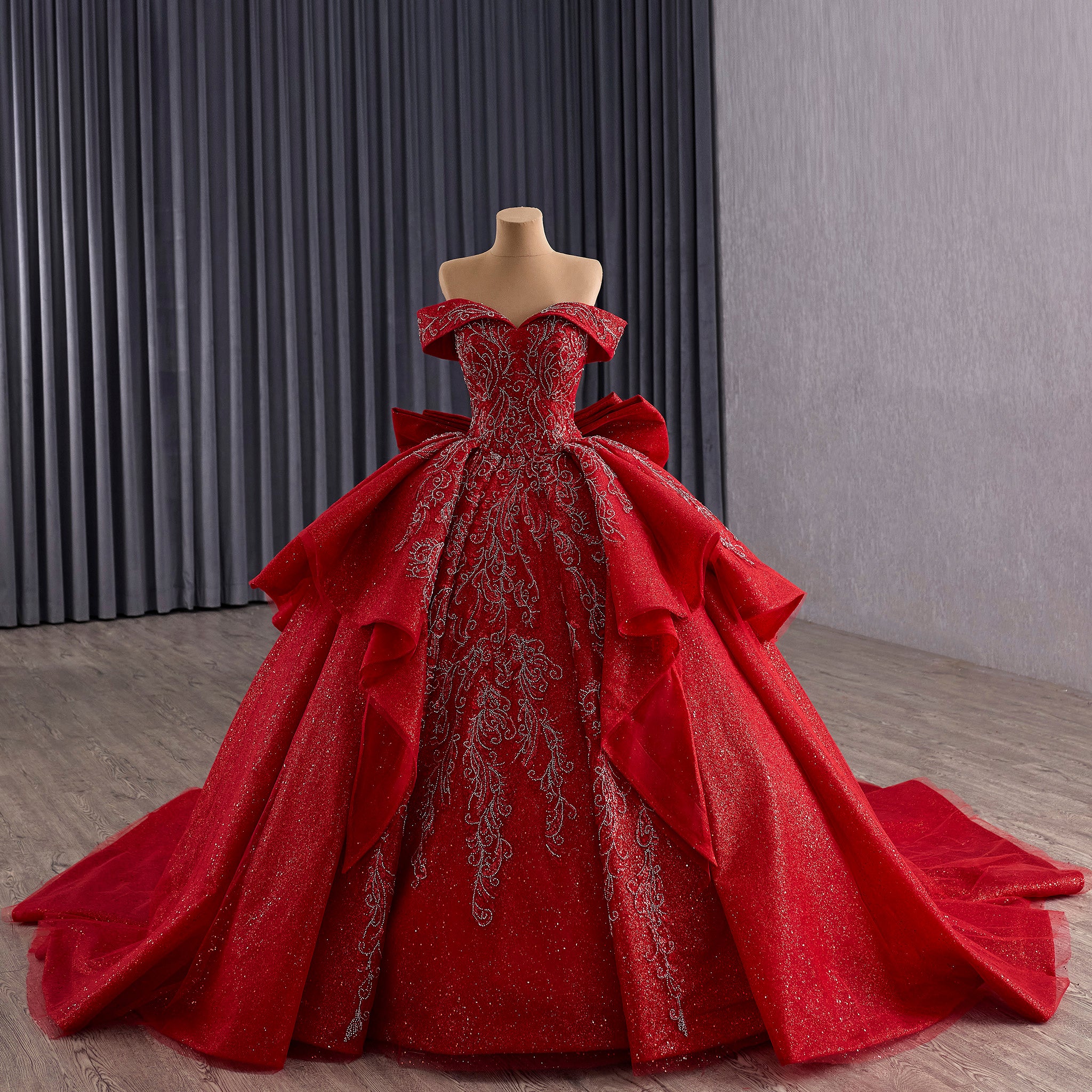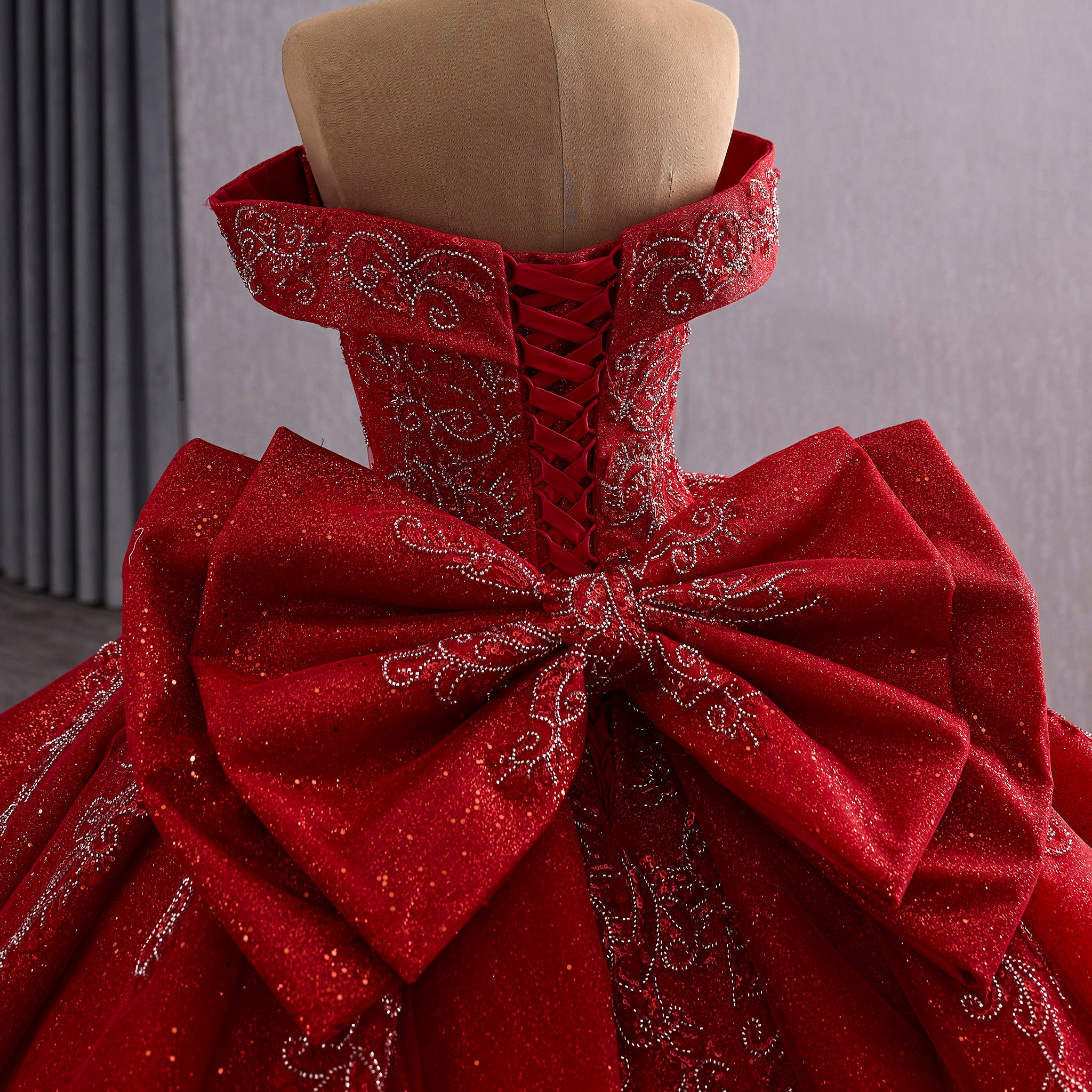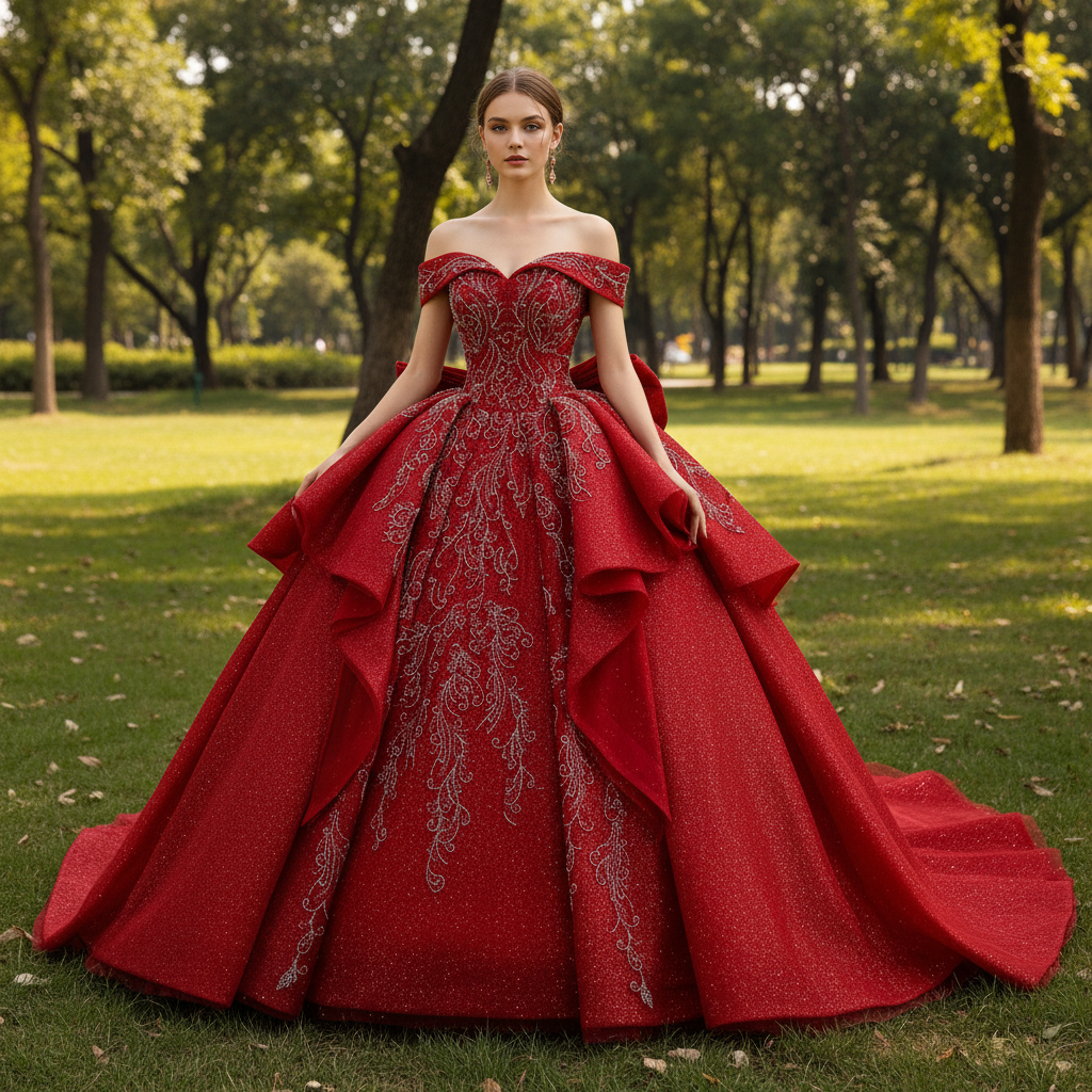 Este llamativo vestido de gala rojo atrae todas las miradas con su color atrevido y su silueta dramática. El escote Bardot enmarca los hombros y la clavícula con elegante gracia, mientras que el corpiño estructurado y adornado con abalorios brilla con intrincadas cuentas plateadas dispuestas en cautivadores diseños. La falda hasta el suelo presenta dramáticas capas escalonadas que caen en cascada desde la cintura hasta el dobladillo, creando volumen, movimiento y una presencia inolvidable a cada paso. Un gran lazo desmontable adorna la espalda, añadiendo un toque majestuoso y llamativo que se puede llevar para la ceremonia y quitar para un look más elegante en la recepción. Perfecto para quinceañeras, bodas o galas formales, este vestido equilibra romanticismo, dramatismo y versatilidad, asegurando que todas las miradas se centren en la mujer que lo lleva.