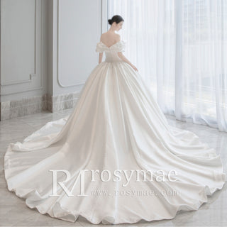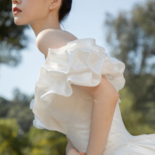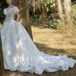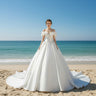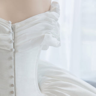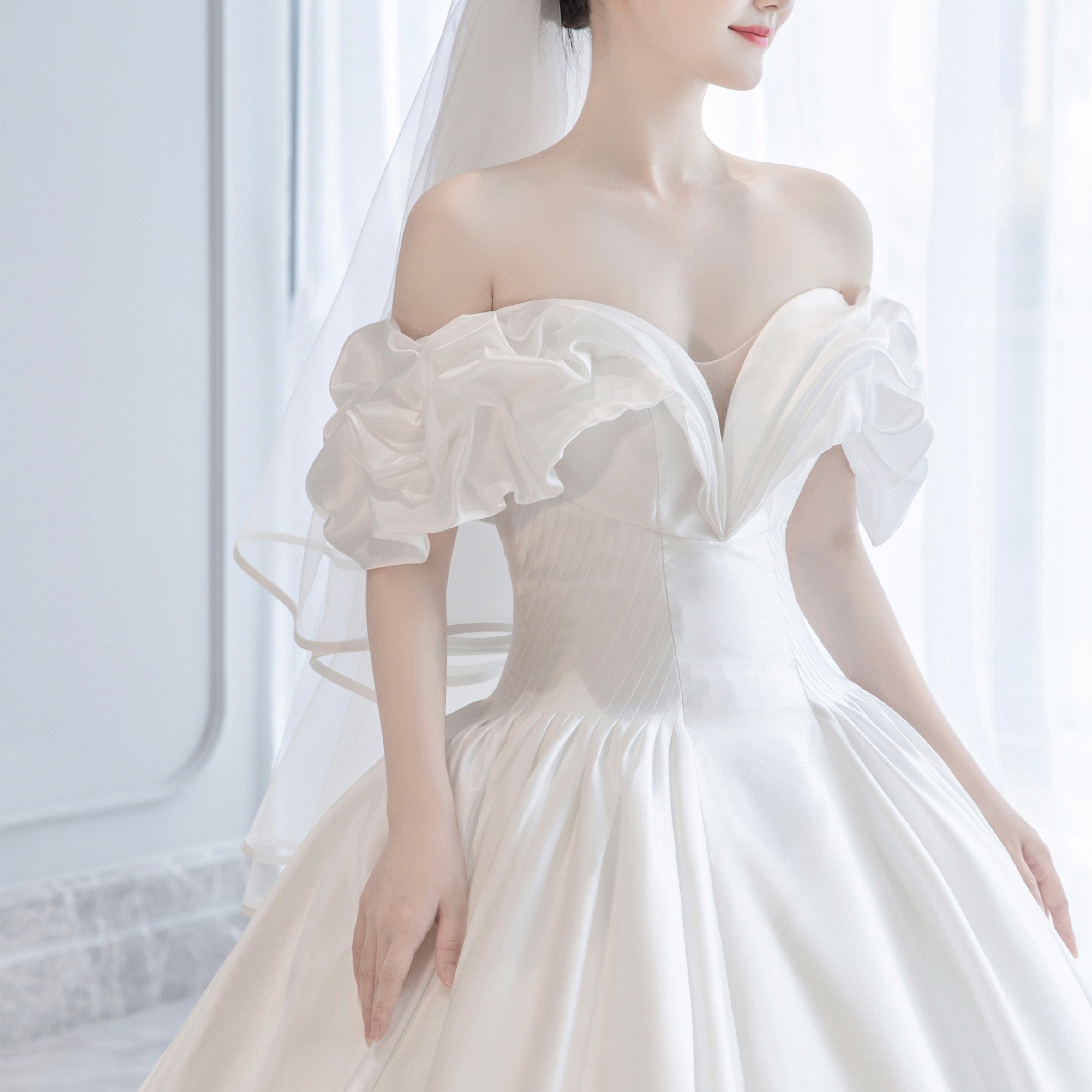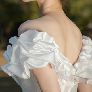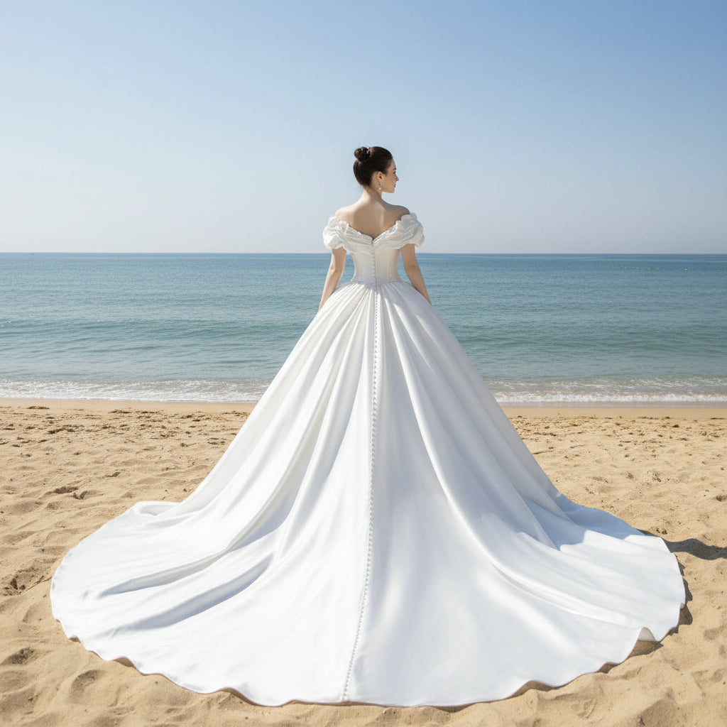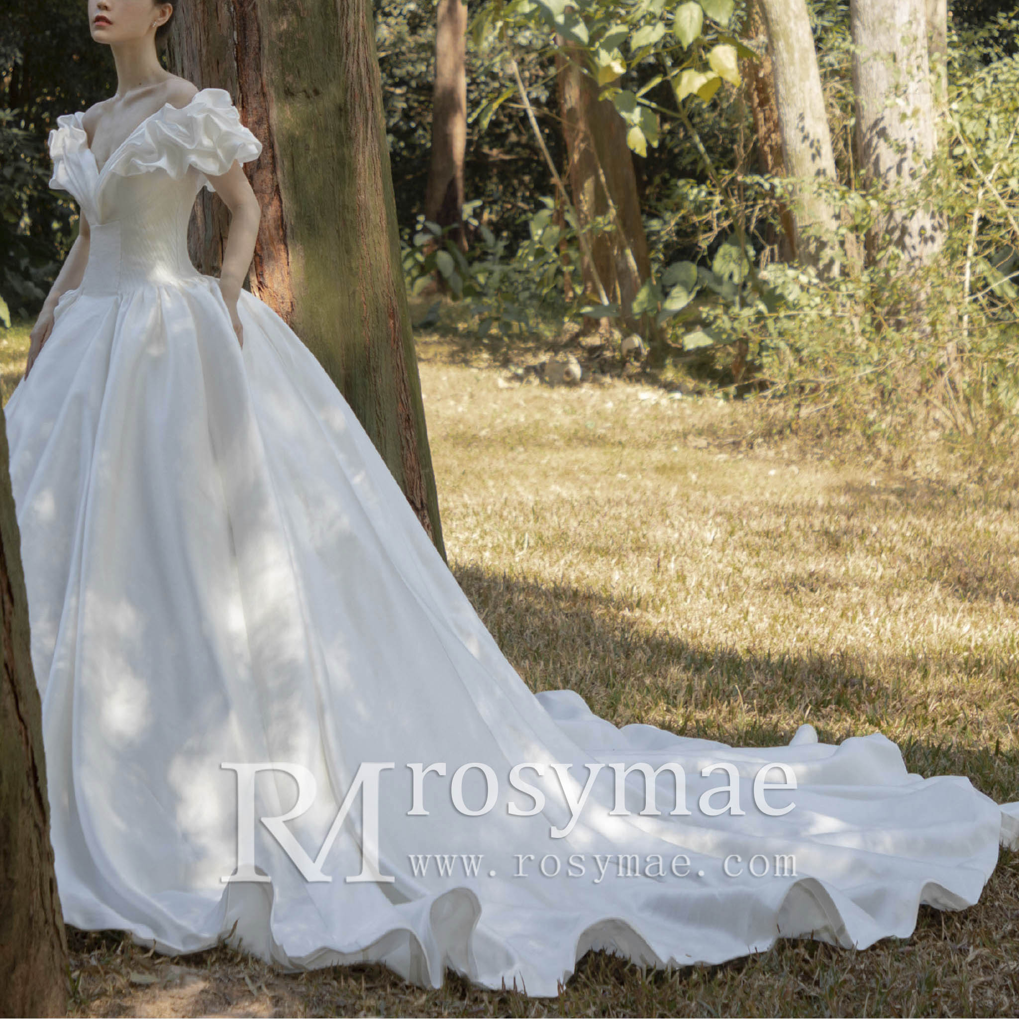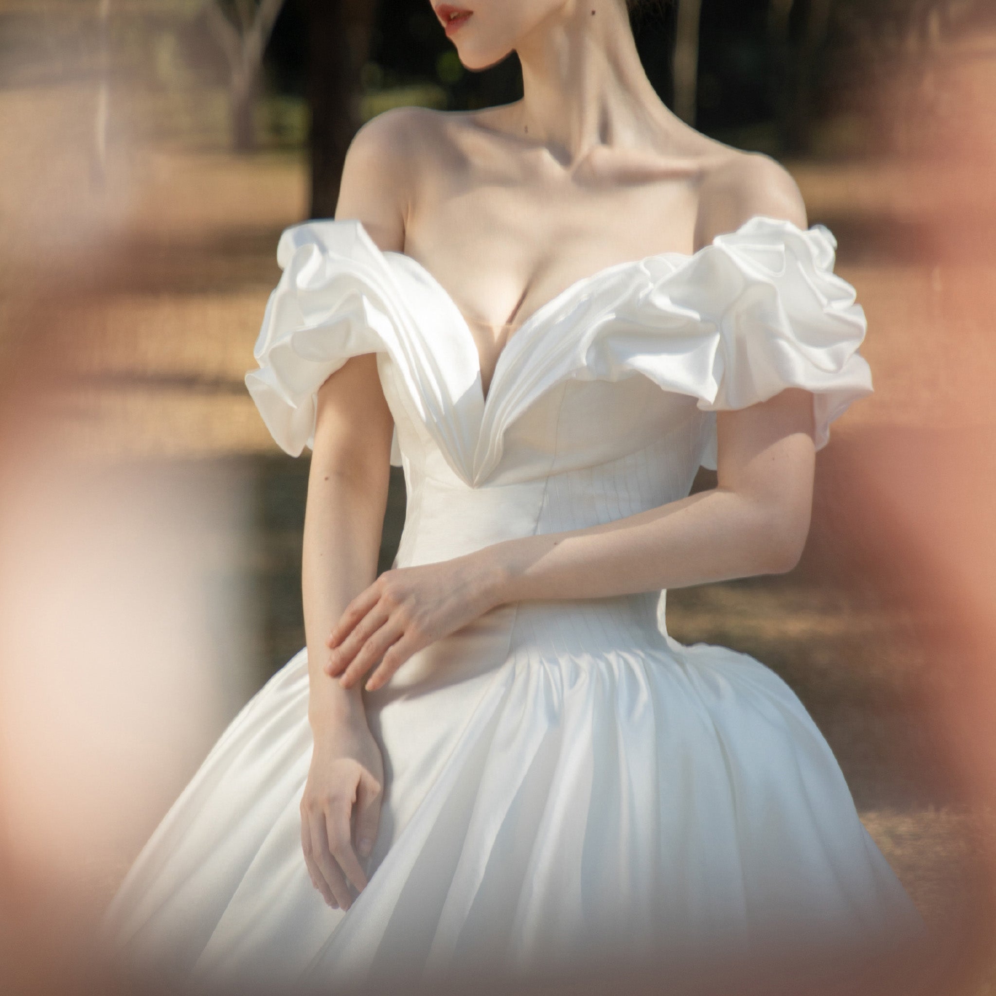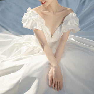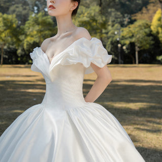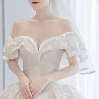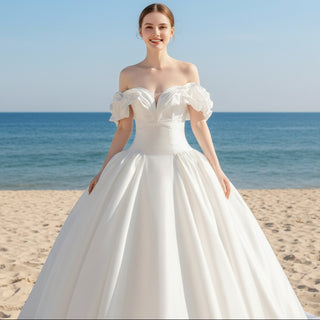 Confeccionado con un diseño de escote en V y espalda escotada, este vestido de novia de satén con hombros descubiertos es la opción ideal para una boda al aire libre. El escote realza el escote, mientras que la espalda escotada aporta un toque de elegancia. Perfecto para cualquier novia que busque un look deslumbrante y sofisticado en su día especial.