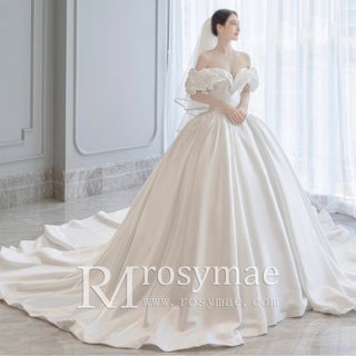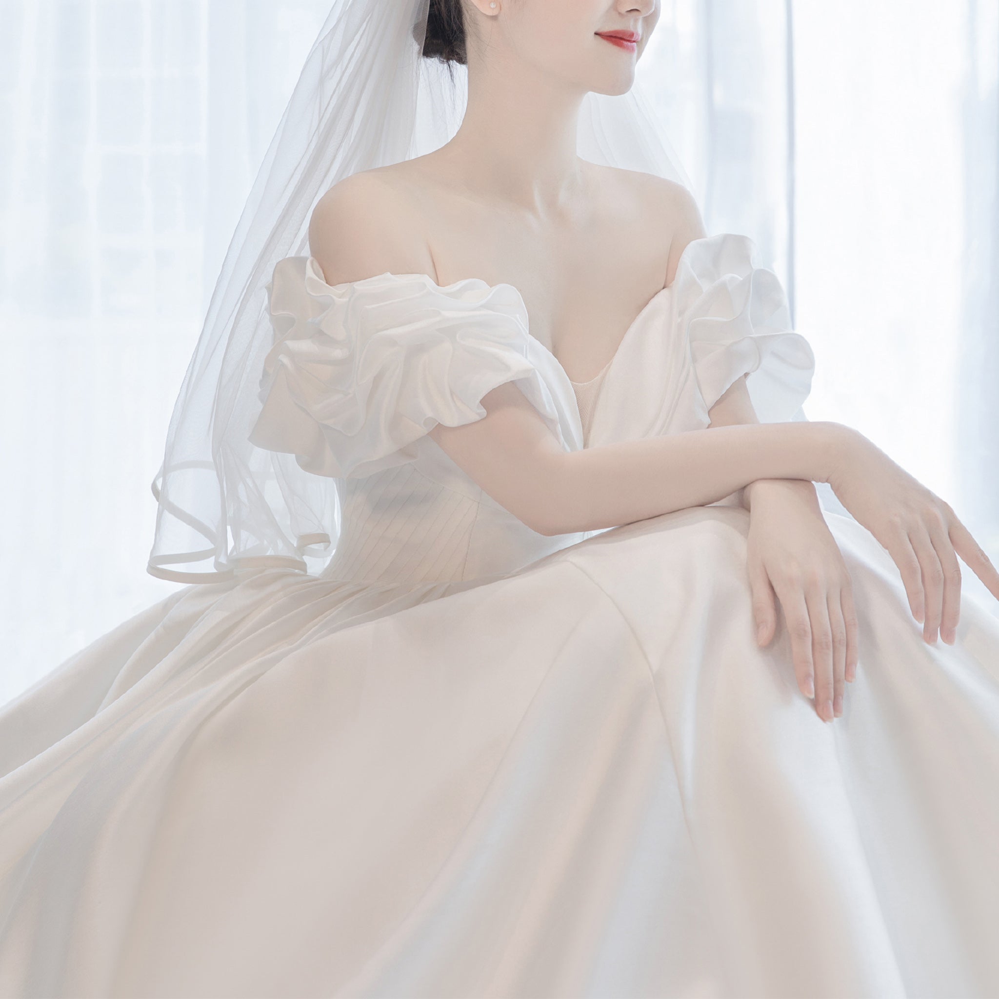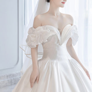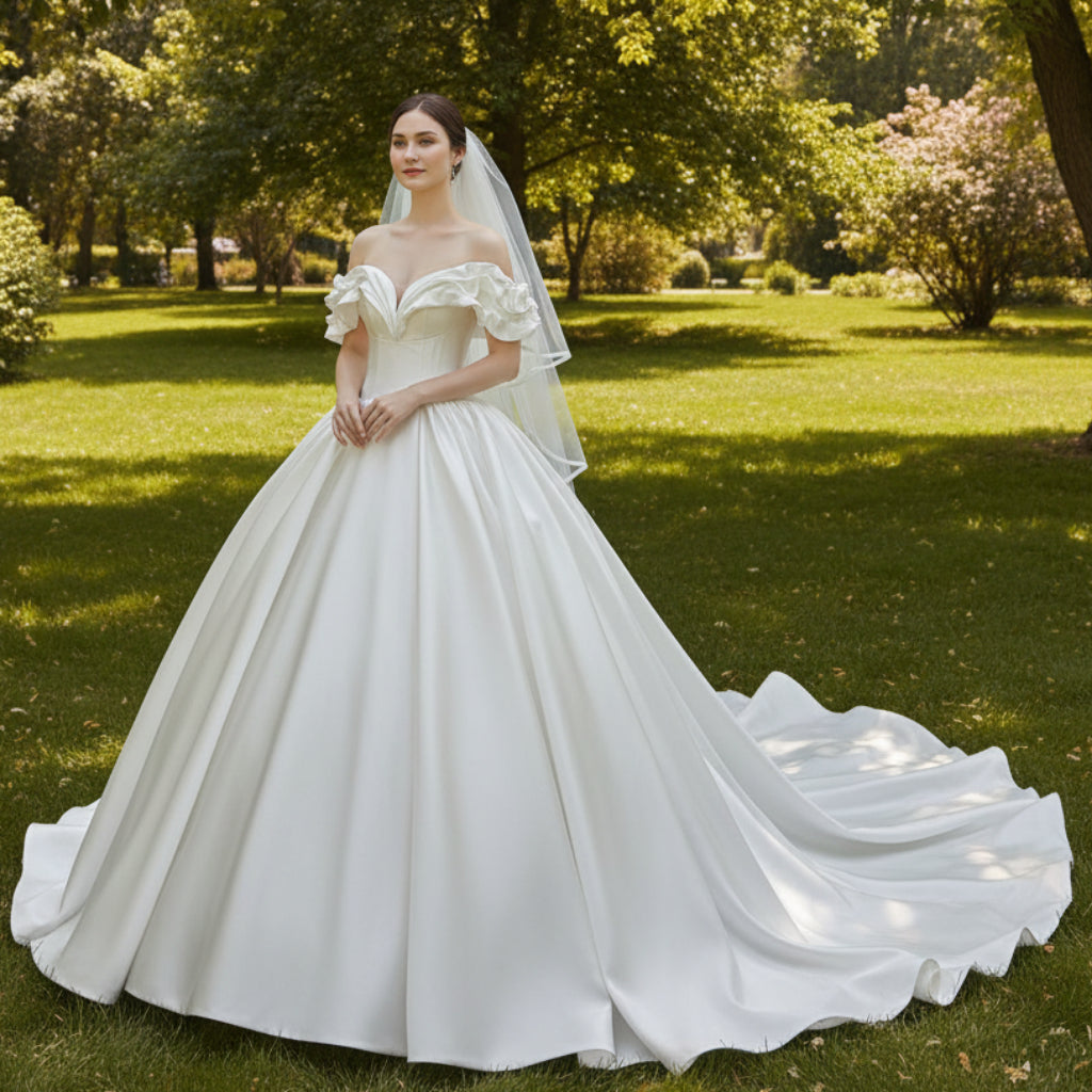 Vestido de novia de satén con hombros descubiertos para bodas al aire libre